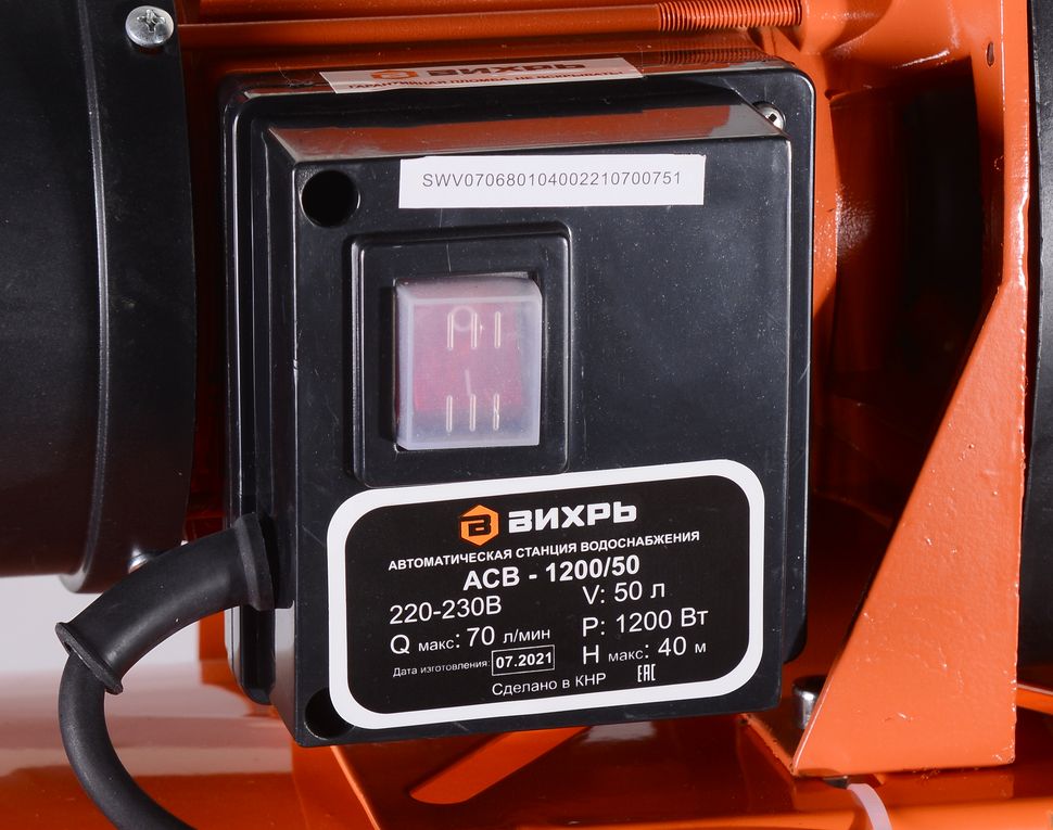 1200 Вт, напор – 40 м, 70 л/мин, гидроаккумулятор – 50 л, насосная часть - пластик