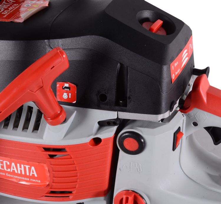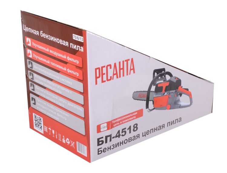 Бензопила БП-4518 Ресанта – легкий и надежный инструмент для дачи и небольшого загородного строительства. Пила укомплектована двигателем на 2,3 л.с.и 45 сантиметровой шиной для заготовки дров и подрезки небольших деревьев. Автоматический тормоз цепи и щиток для рук обеспечивают безопасность. Воздушный фильтр защищен специальным кожухом, который легко открывается с помощью специального поворотного колесика. Рукоятка бензопилы БП-4518 Ресанта имеет удобную для захвата форму. Расширенная нижняя часть рукоятки - для защиты руки при разрыве цепи. Объем бака в 0,55 литра хватает на долгую работу без дозаправки. В полной комплектации пила весит 7 кг.