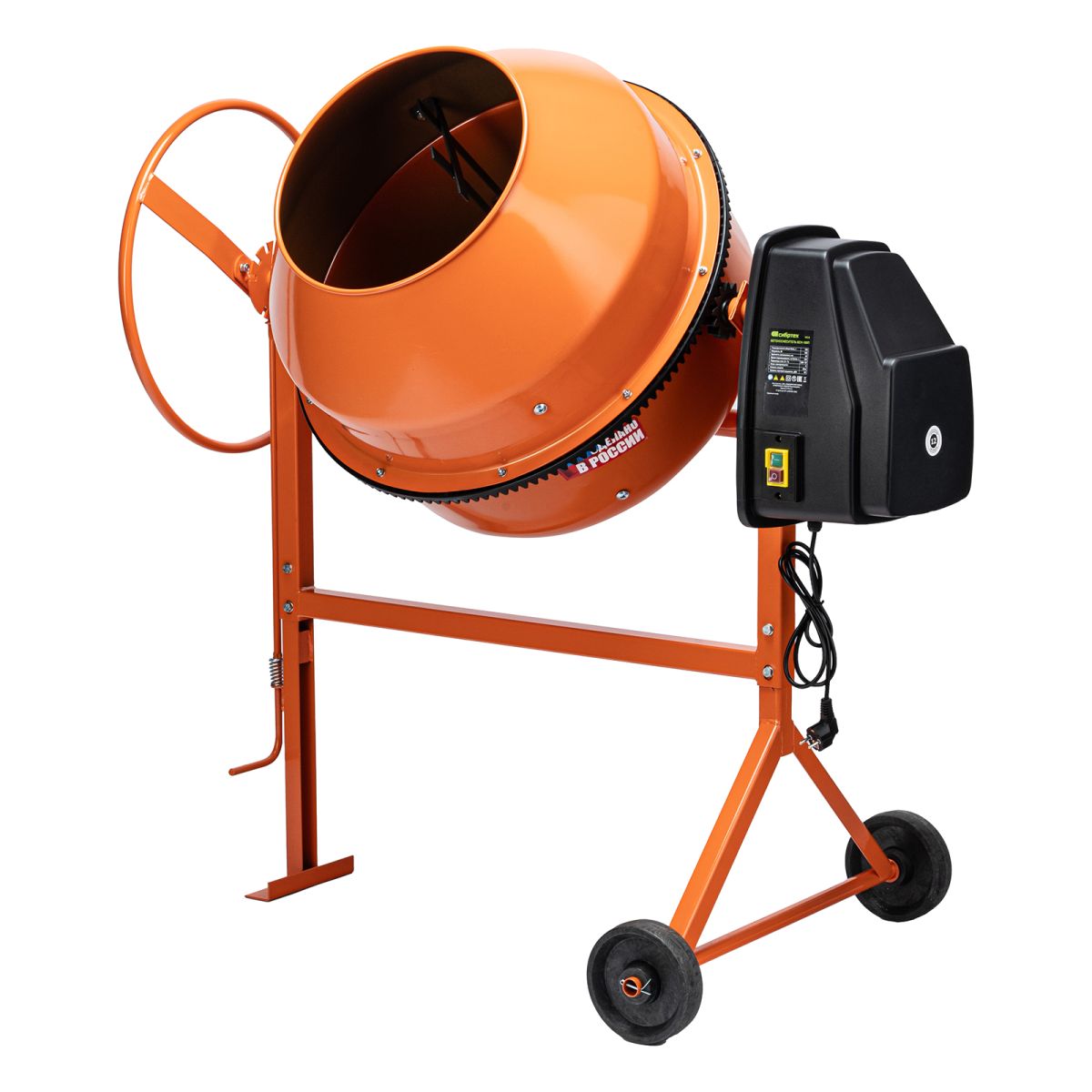 - Удобная загрузка и выгрузка смеси — барабан наклоняется при помощи маховика и легко фиксируется в нужном положении.