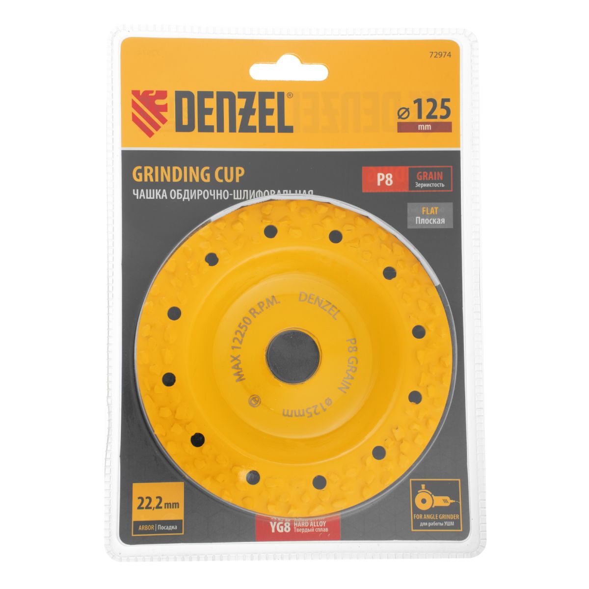 Твердосплавная зачистная чашка Denzel 72974 плоской формы, диаметром 125 мм, с крупным абразивным зерном P8, — оснастка для углошлифовальной машины, предназначенная для проведения обдирочных работ. Оптимальна для грубой обработки твердой и мягкой древесины, пластика, резины, газобетона, кирпича. Позволяет быстро и эффективно выровнять поверхность, удалить старое лакокрасочное покрытие, остатки клея, цемента и т.д. Не подходит для шлифования металла и твердого камня (гранита)! Благодаря облегченному корпусу чашки нагрузка на УШМ снижена, что продлевает срок службы инструмента.