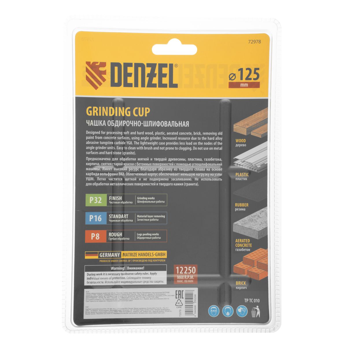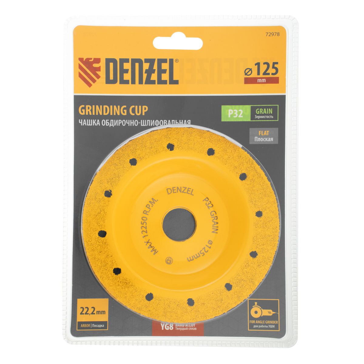 Твердосплавная зачистная чашка Denzel 72978 диаметром 125 мм, с плоской рабочей частью и мелким зерном P32, используется для проведения шлифовальных работ при помощи углошлифовальной машины (УШМ). Мелкозернистый абразив оптимален для чистовой обработки твердой и мягкой древесины, кирпича, пластика, резины, газобетона. С помощью чашки можно устранить мелкие неровности, остатки старого покрытия, подготовить поверхности к дальнейшей отделке. Режущие частицы из твердого сплава ВК8 не образуют абразивную пыль, что снижает вредное воздействие на здоровье пользователя. Оснастка пригодится при проведении строительных, ремонтных и отделочных работ.