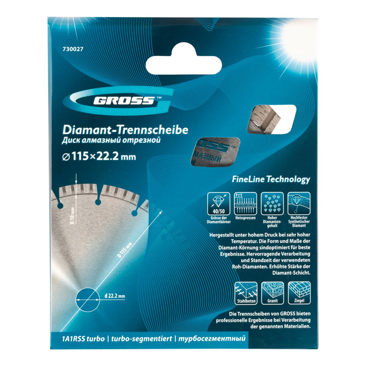 Алмазный диск Gross 730327 диаметром 180 х 22,2 мм, с рабочей частью «турбо», применяется для сухой резки твердых материалов: бетона, в том числе свежего, среднеармированного железобетона, кирпича, гранита, камня и песчаника. Работа с разными типами материалов возможна благодаря оптимально подобранной металлической связке. Инструмент используется в качестве расходника на профессиональных УШМ.