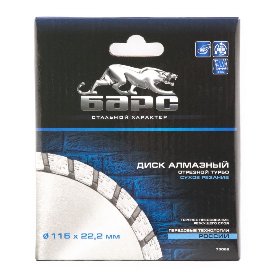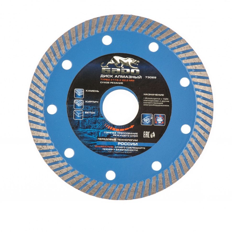 Алмазный диск Барс Турбо 73069 диаметром 115 х 22,2 мм предназначен для сухого резания бетона, в т.ч. свежего, среднеармированного железобетона, камня, кирпича, гранита и песчаника. Совместим с УШМ с посадочным диаметром 22,2 мм, используется для проведения строительных и ремонтных работ.