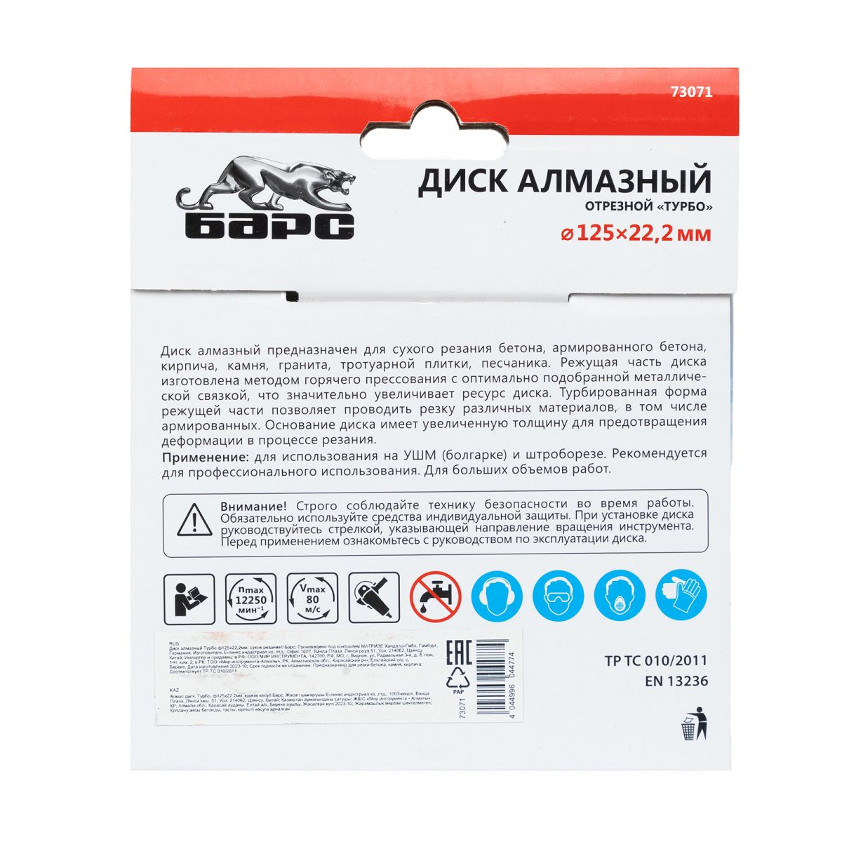 Алмазный диск Барс Турбо 73071 диаметром 125 х 22,2 мм предназначен для сухого резания бетона, в т.ч. свежего, среднеармированного железобетона, камня, кирпича, гранита и песчаника. Совместим с УШМ с посадочным диаметром 22,2 мм, используется для проведения строительных и ремонтных работ.