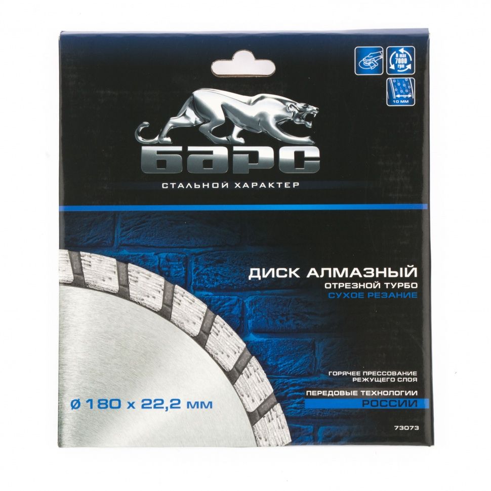 Алмазный диск Барс Турбо 73073 диаметром 180 х 22,2 мм предназначен для сухого резания бетона, в т.ч. свежего, среднеармированного железобетона, камня, кирпича, гранита и песчаника. Совместим с УШМ с посадочным диаметром 22,2 мм, используется для проведения строительных и ремонтных работ.