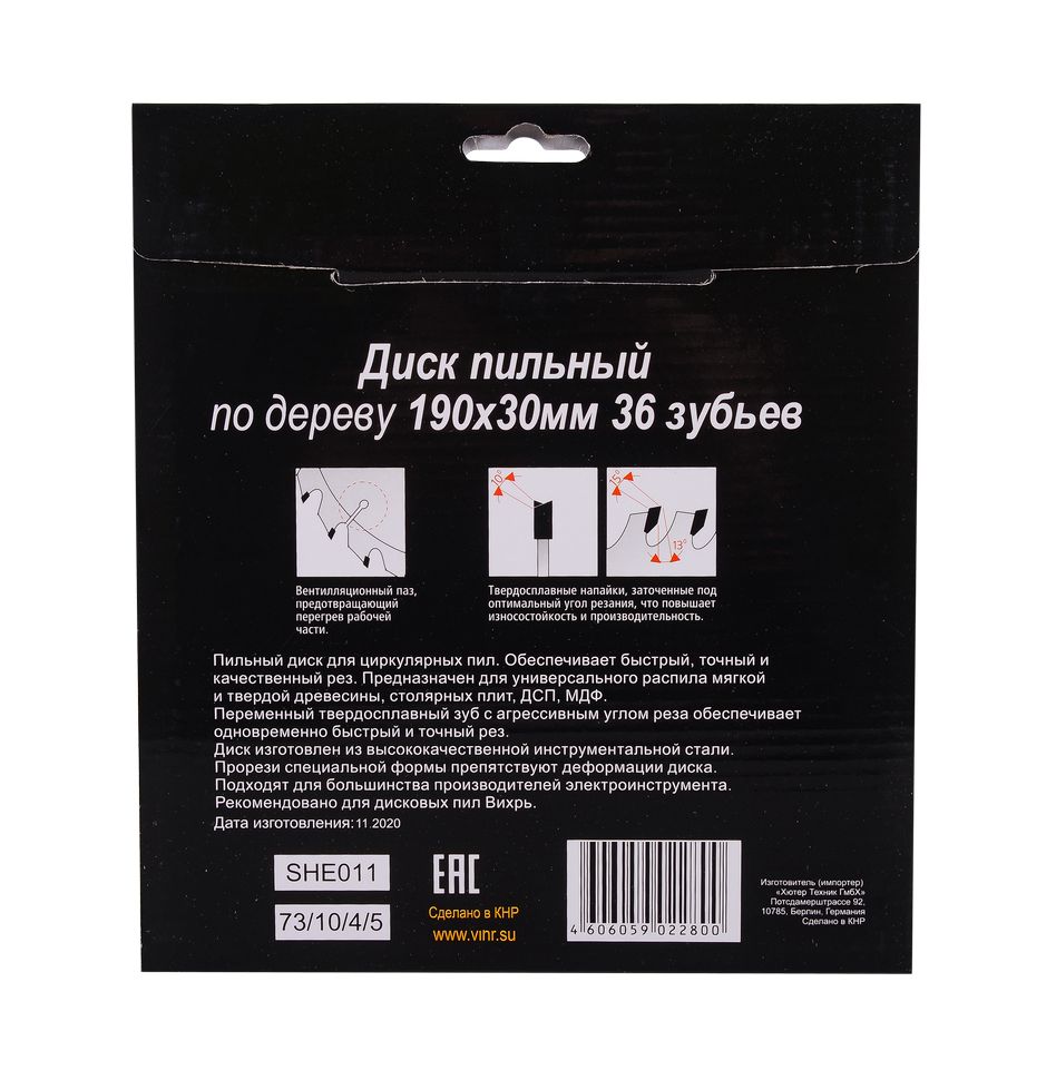Диск пильный по дереву Вихрь 190х30мм, 36 зубьев