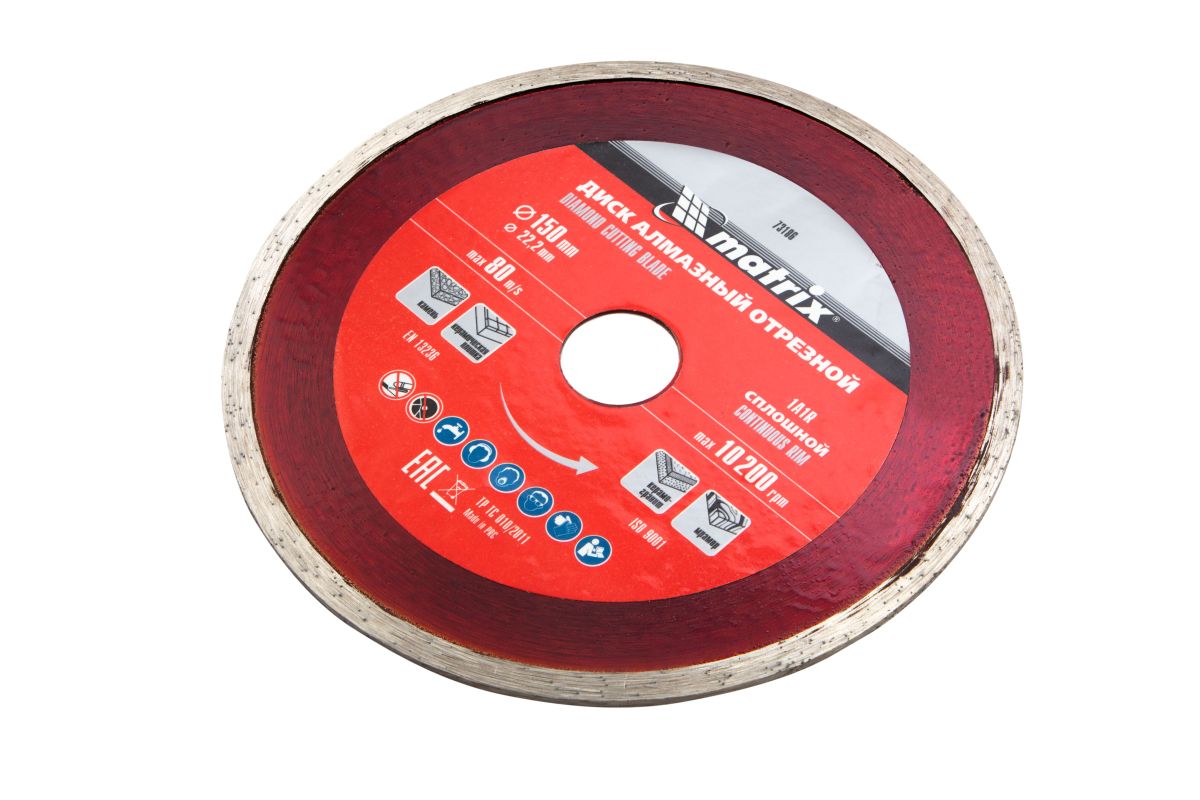 Отрезной алмазный сплошной диск Matrix 73186 диаметром 150 х 22,2 мм предназначен для мокрой резки мрамора, керамической плитки, керамогранита, натурального или искусственного камня. Устанавливается на углошлифовальную машину или плиткорез с посадочным диаметром 22,2 мм. Благодаря использованию водяного охлаждения улучшается качество реза, а также продлевается срок службы диска.