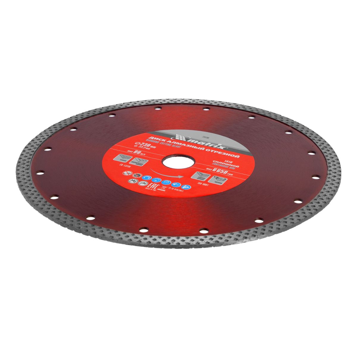 Сплошной отрезной алмазный диск Matrix 73136 диаметром 230 мм — оснастка для болгарок и плиткорезов с диаметром вала 22,2 мм. Применяется для сухого и мокрого резания мрамора, искусственного и натурального камня, керамогранитной и керамической плитки. Использование без подачи воды расширяет возможности инструмента, но для увеличения ресурса диска рекомендуется применять водяное охлаждение. Оснастка предназначена для решения бытовых задач.