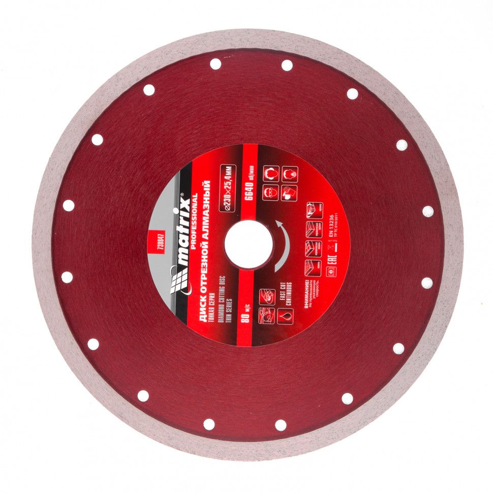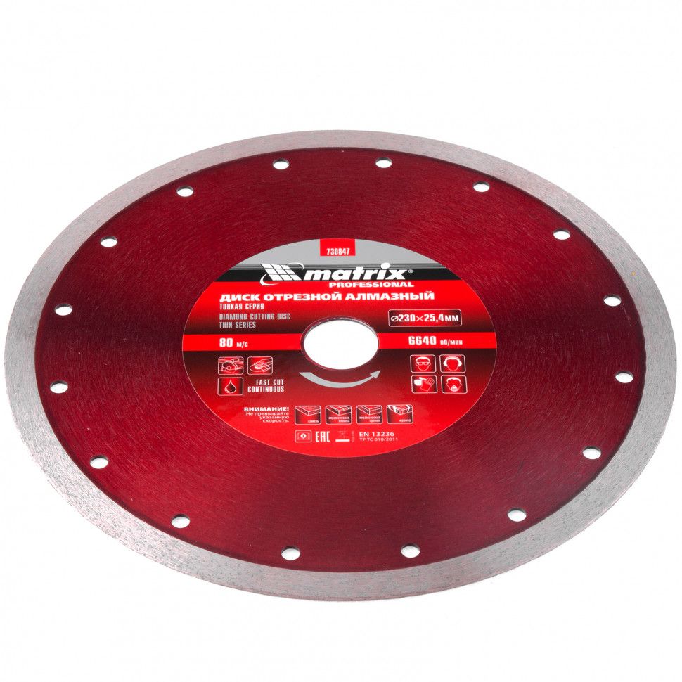 Тонкий сплошной алмазный диск Matrix 230 х 25,4 мм 730847 обеспечивает мокрое резание плотных материалов: керамогранита, керамической и кафельной плитки, мрамора, натурального и искусственного камня. Он устанавливается на УШМ или плиткорезы и используется с применением водяного охлаждения. Диск увеличивает производительность на 20% благодаря небольшой толщине 2,1 мм и снижению нагрузки на инструмент.