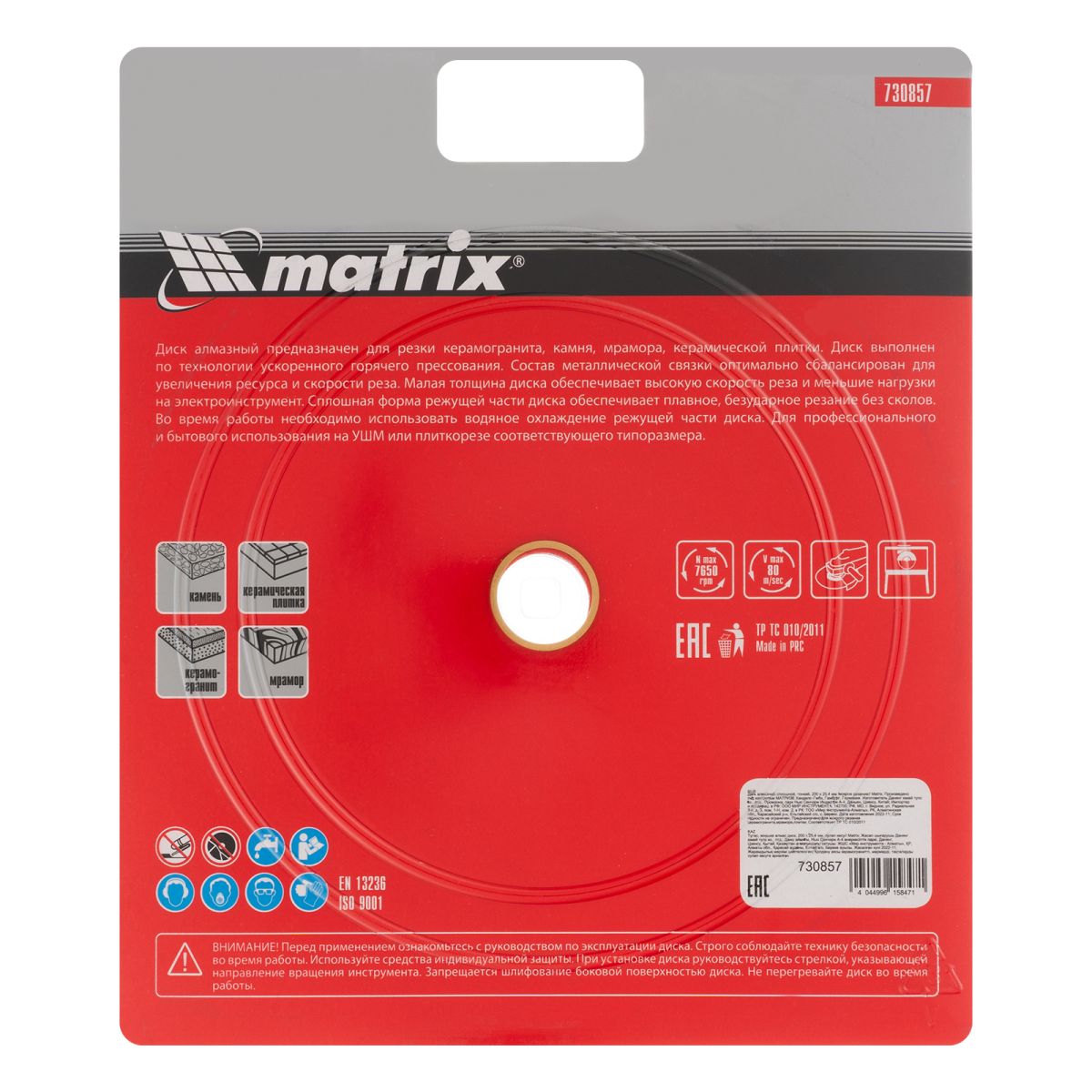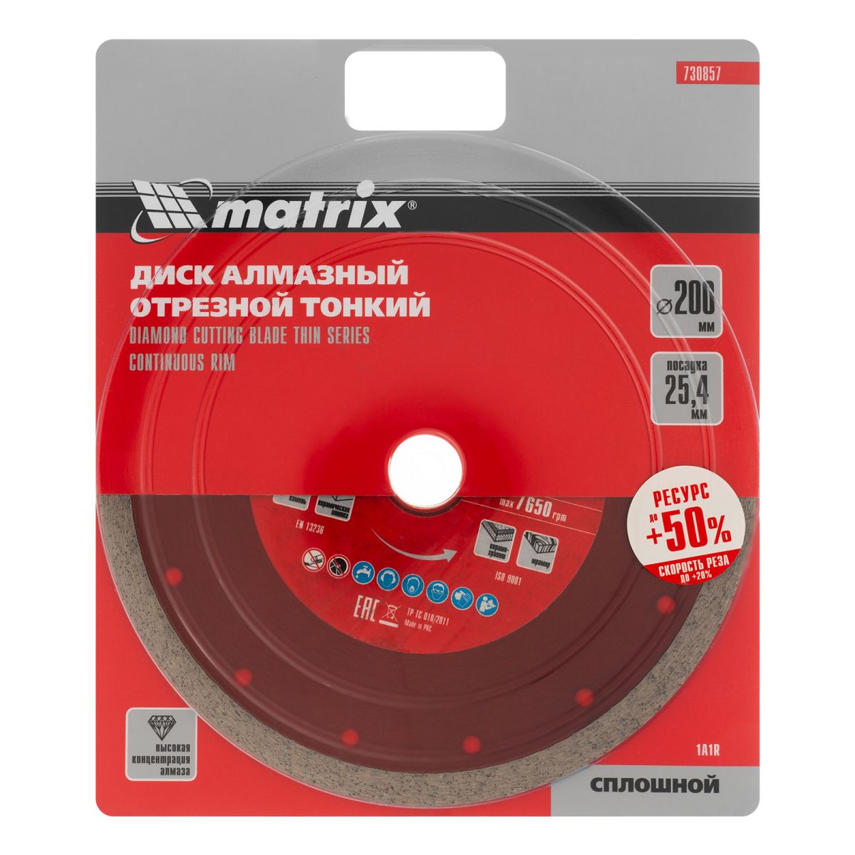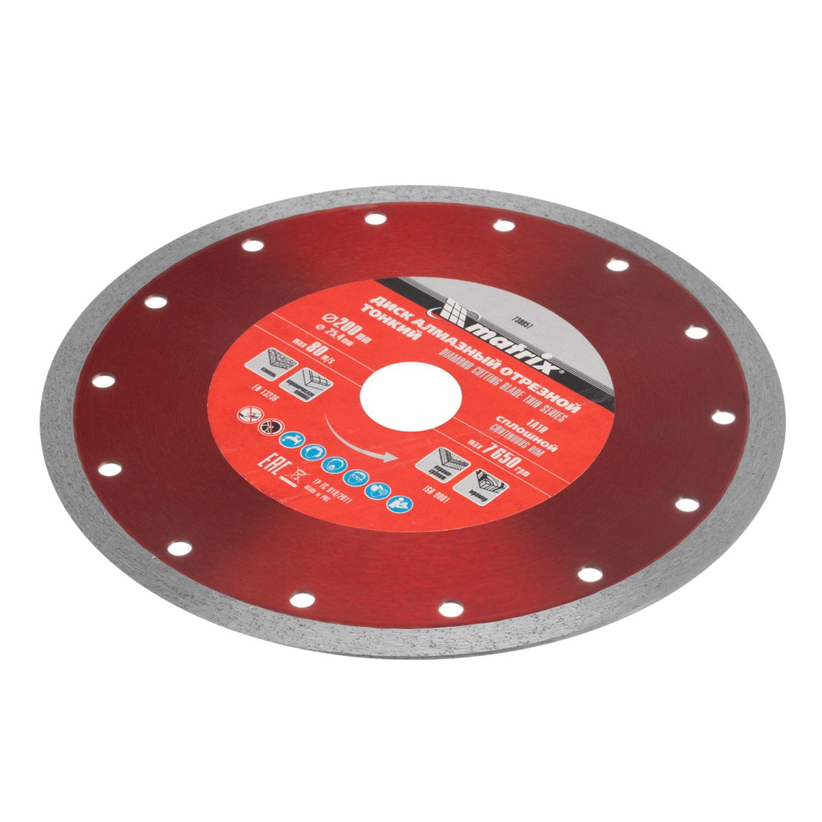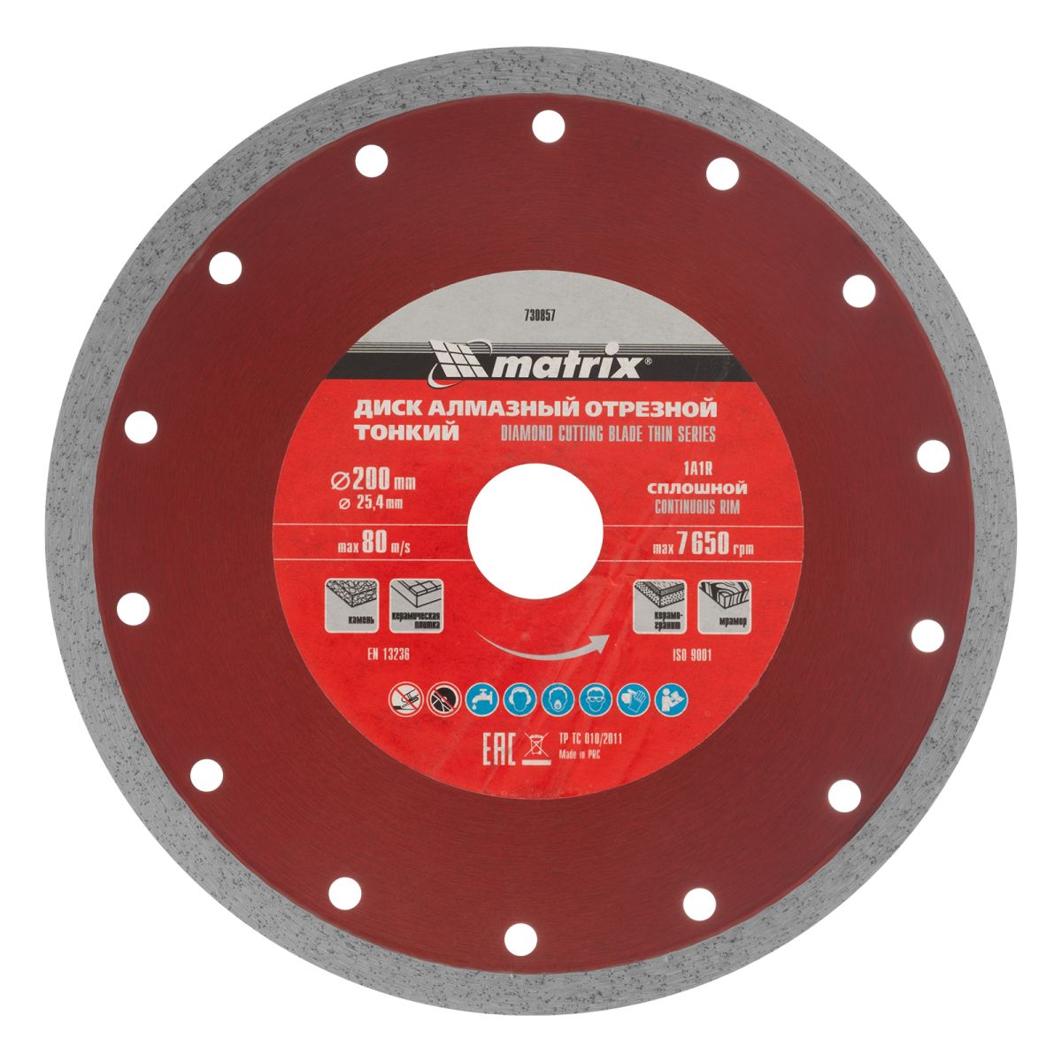 Тонкий сплошной алмазный диск Matrix 200 х 25,4 мм 730857, тонкий, обеспечивает мокрое резание плотных материалов: керамогранита, керамической и кафельной плитки, мрамора, натурального и искусственного камня. Он устанавливается на УШМ или плиткорезы и используется с применением водяного охлаждения. Диск увеличивает производительность на 20% благодаря небольшой толщине 2,1 мм и снижению нагрузки на инструмент.
