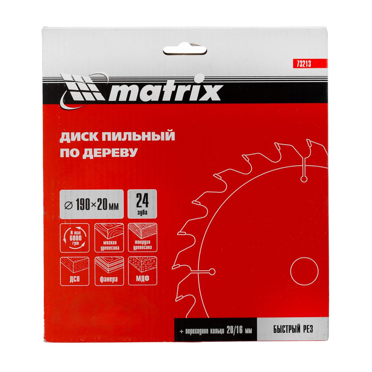 Пильный диск по дереву Matrix 73213 диаметром 190 х 20 мм, с 24 зубьями и переходным кольцом 20/16, — оснастка для циркулярных и торцовочных пил с соответствующим посадочным и внешним диаметром. Используется для продольного/поперечного реза материалов из мягкой и твердой древесины, ДСП, ДВП, фанеры, столярных плит. В комплект поставки входит переходное кольцо 20/16, позволяющее самостоятельно изменить посадочный диаметр при необходимости. Диск подходит для бытового и профессионального применения.