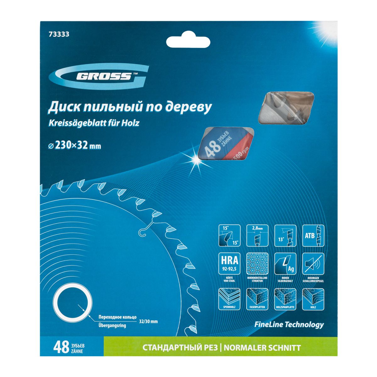 Пильный диск Gross 73333 диаметром 230 х 32 мм, с 48 зубьями и переходным кольцом 32/30 мм, предназначен для распила древесины мягких и твердых пород, ДСП, МДФ и фанеры. Используется в качестве оснастки для циркулярных и торцовочных пил с посадочным диаметром 32 мм, благодаря универсальному типу зубьев АТВ используется преимущественно для поперечного реза материалов. Диск изготовлен на высококачественном оборудовании, специально рассчитан на профессиональное применение и выполнение большого объема работ.