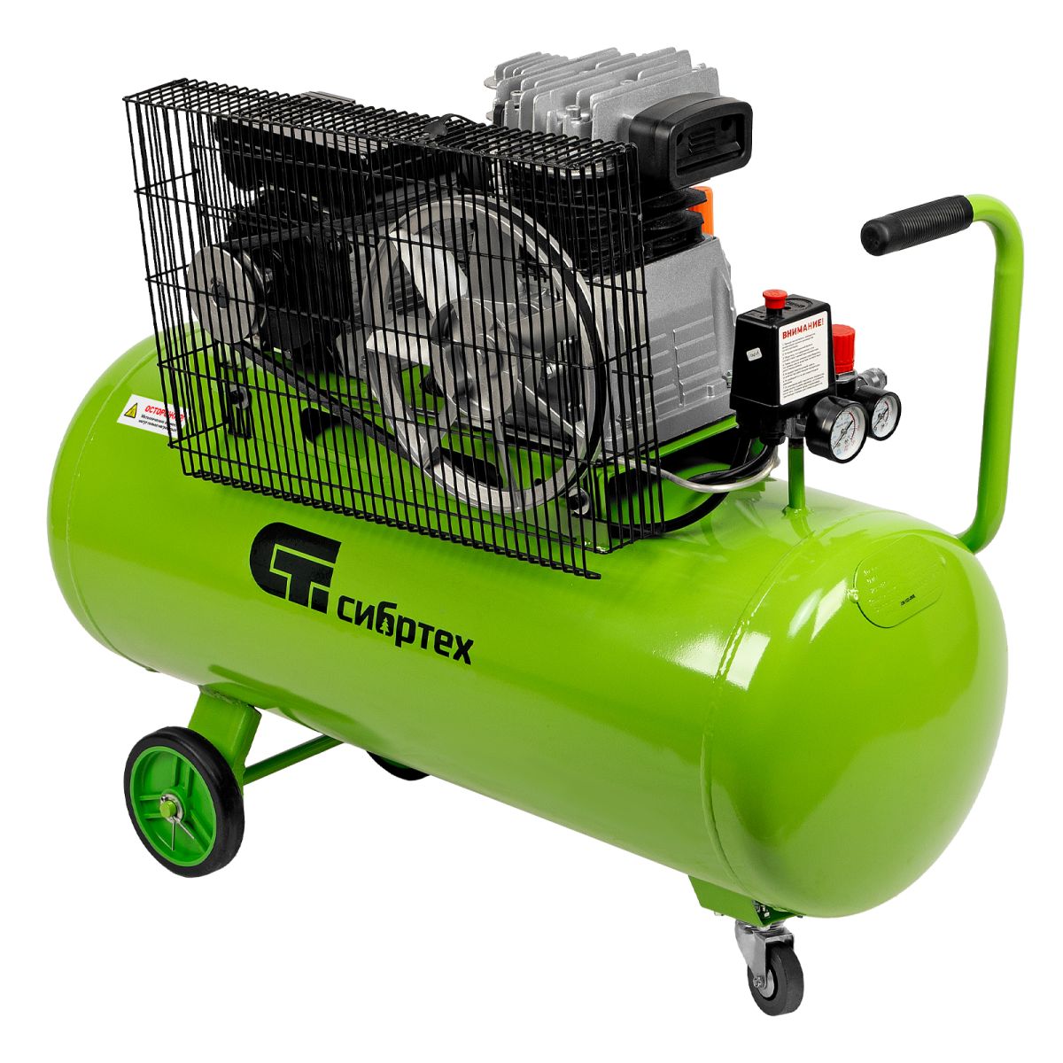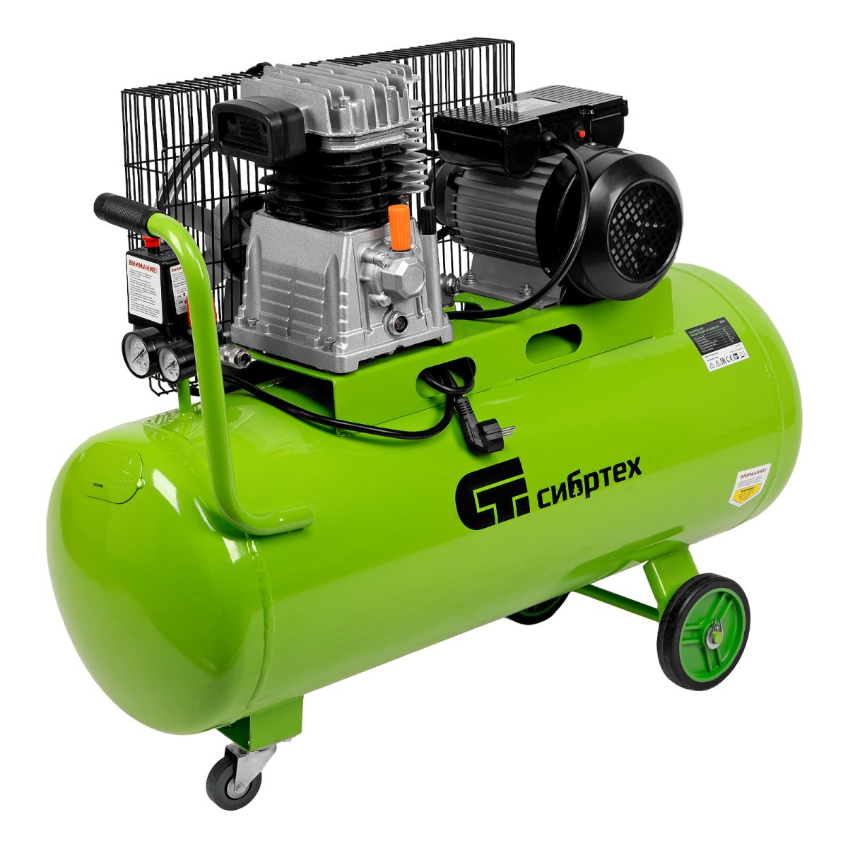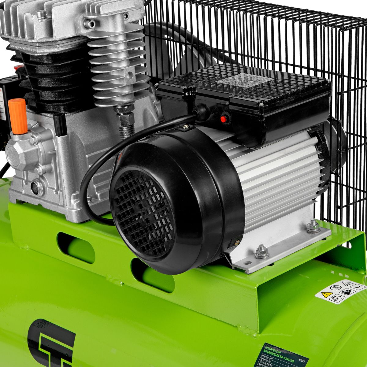 Масляный компрессор с ременным приводом относится к наиболее производительным моделям. Мощность 2.2 кВт, позволяет генерировать 350 л сжатого воздуха в минуту под давлением 10 бар. Такой производительности хватит для долговременных работ на небольших производствах, в автосервисах, на стройках или СТО. Перед сжатием воздух проходит через фильтр очистки, после — отправляется в ресивер объемом 100 л.,Чугунные цилиндры с большими ребрами охлаждения надежно защищают двигатель от перегрева. Встроенная защита от перегрузки отключит двигатель в случае необходимости, что позволит избежать поломки. Ременной привод защищен металлическим кожухом для безопасности оператора.