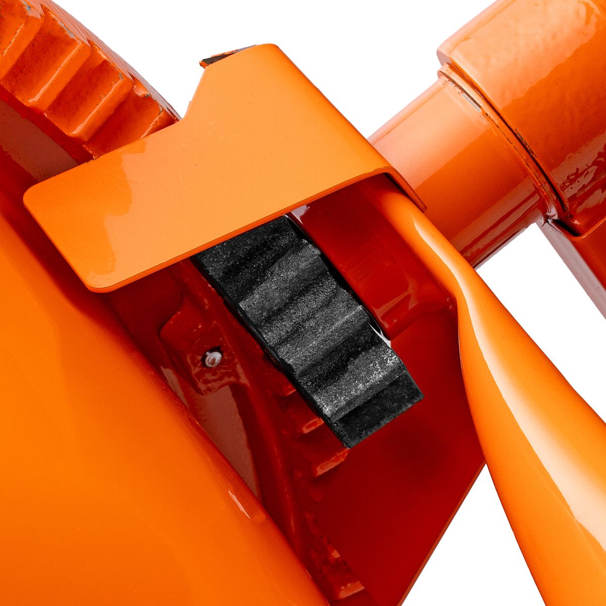 - Надежная конструкция — крепление траверсы к раме выполнено с полным охватом осей в 360°, стальные подкосы равномерно распределяют нагрузку и повышают устойчивость бетономешалки к вибрациям.