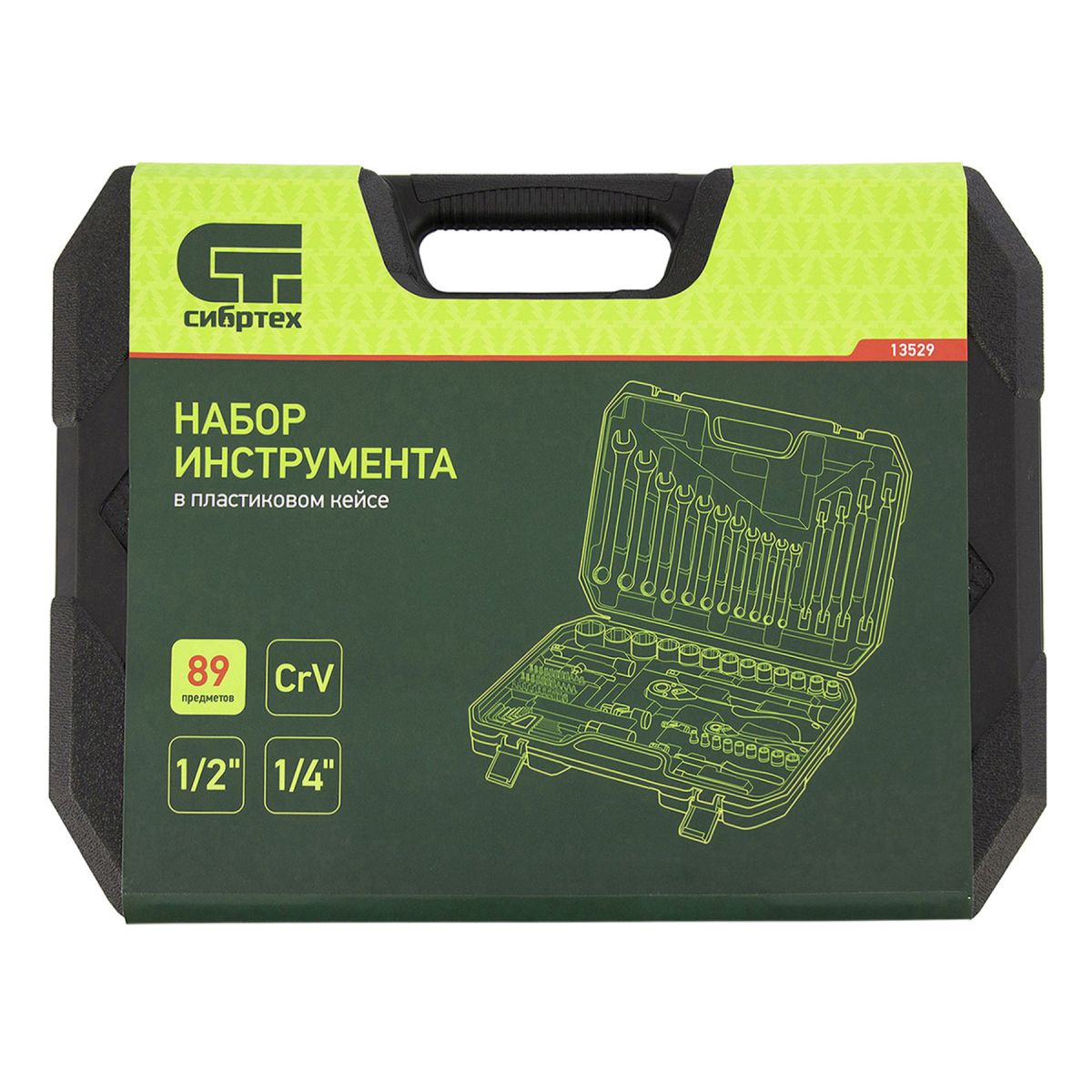 Набор инструментов Сибртех 13529 упакован в пластиковый кейс и состоит из 89 предметов из стали CrV, с присоединительными размерами 1/2" и 1/4". Предназначен для монтажа и демонтажа резьбового крепежа с разными типами шлицев. В комплект поставки входят карданы, удлинители и шарнирные ключи, облегчающие работу в труднодоступных местах. Набор используется для ремонта автомобилей, а также полезен в быту.