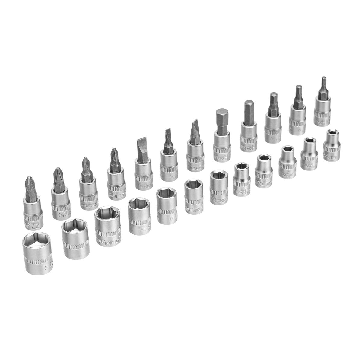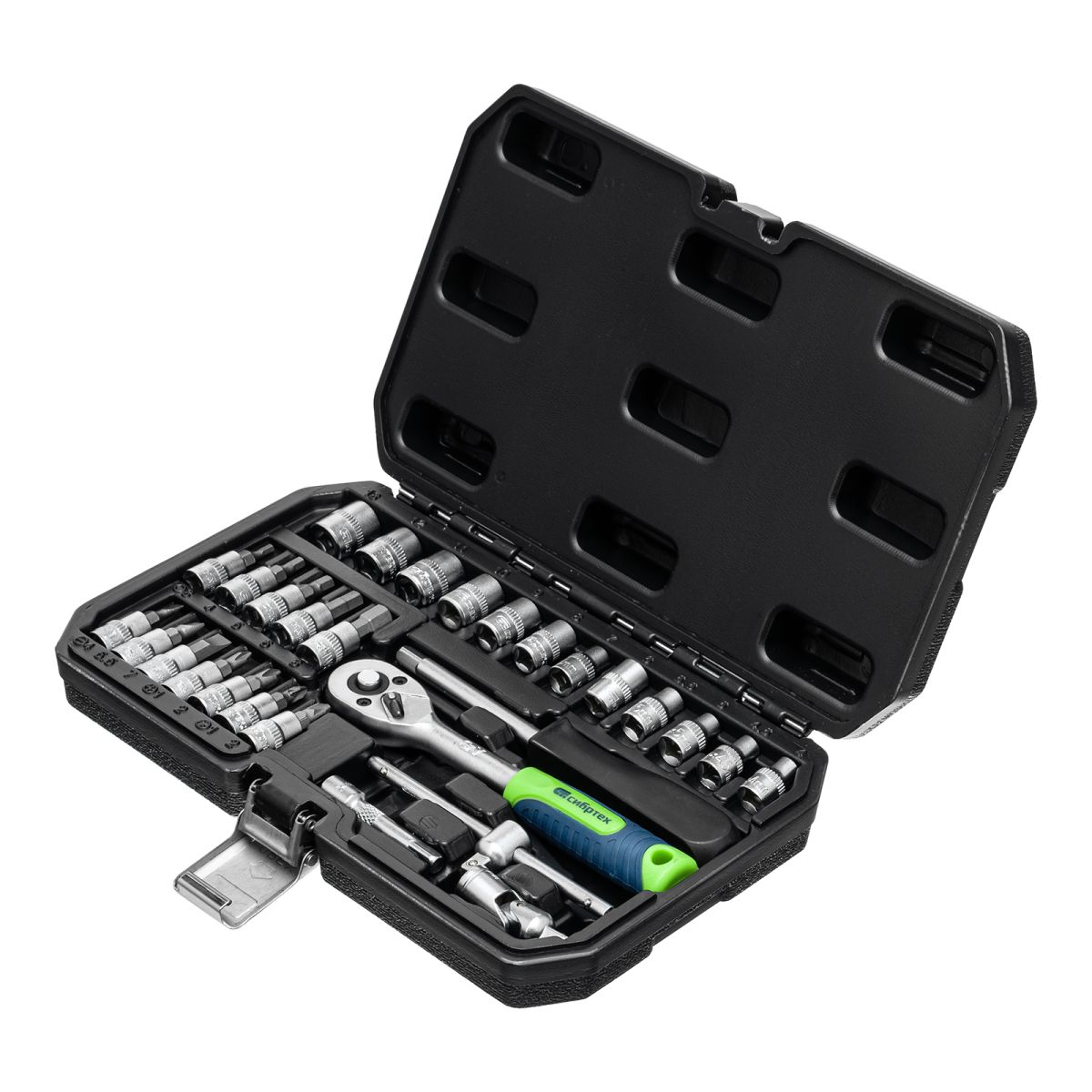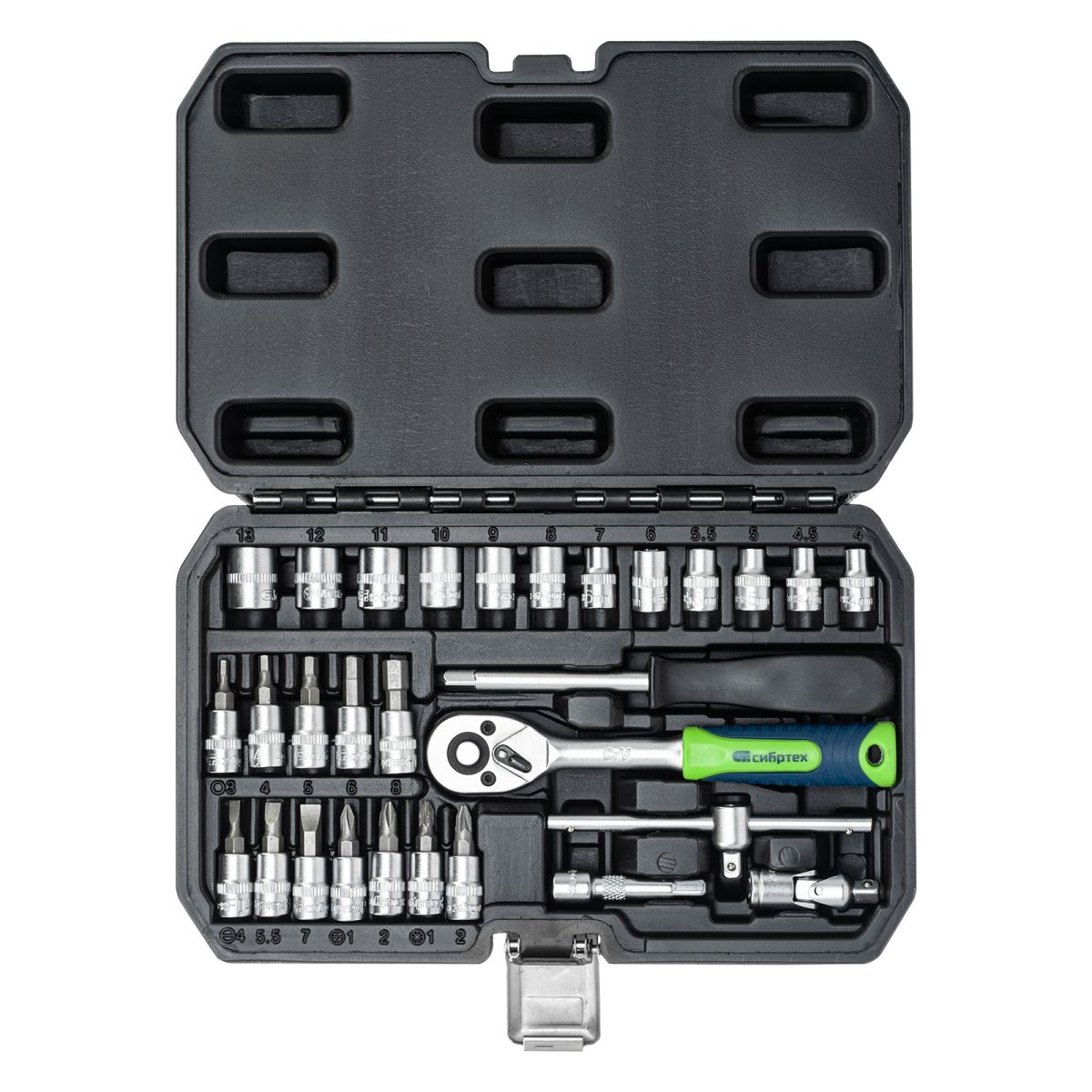Набор инструментов Сибртех 13392, поставляющийся в пластиковом кейсе, состоит из 29 предметов с присоединительным размером 1/4", предназначенных для работы с резьбовыми соединениями. В комплект поставки входят кардан, удлинитель и вороток, упрощающие работу в труднодоступных местах. Набор будет полезен автолюбителю и домашнему мастеру.