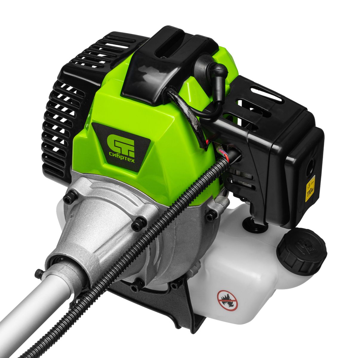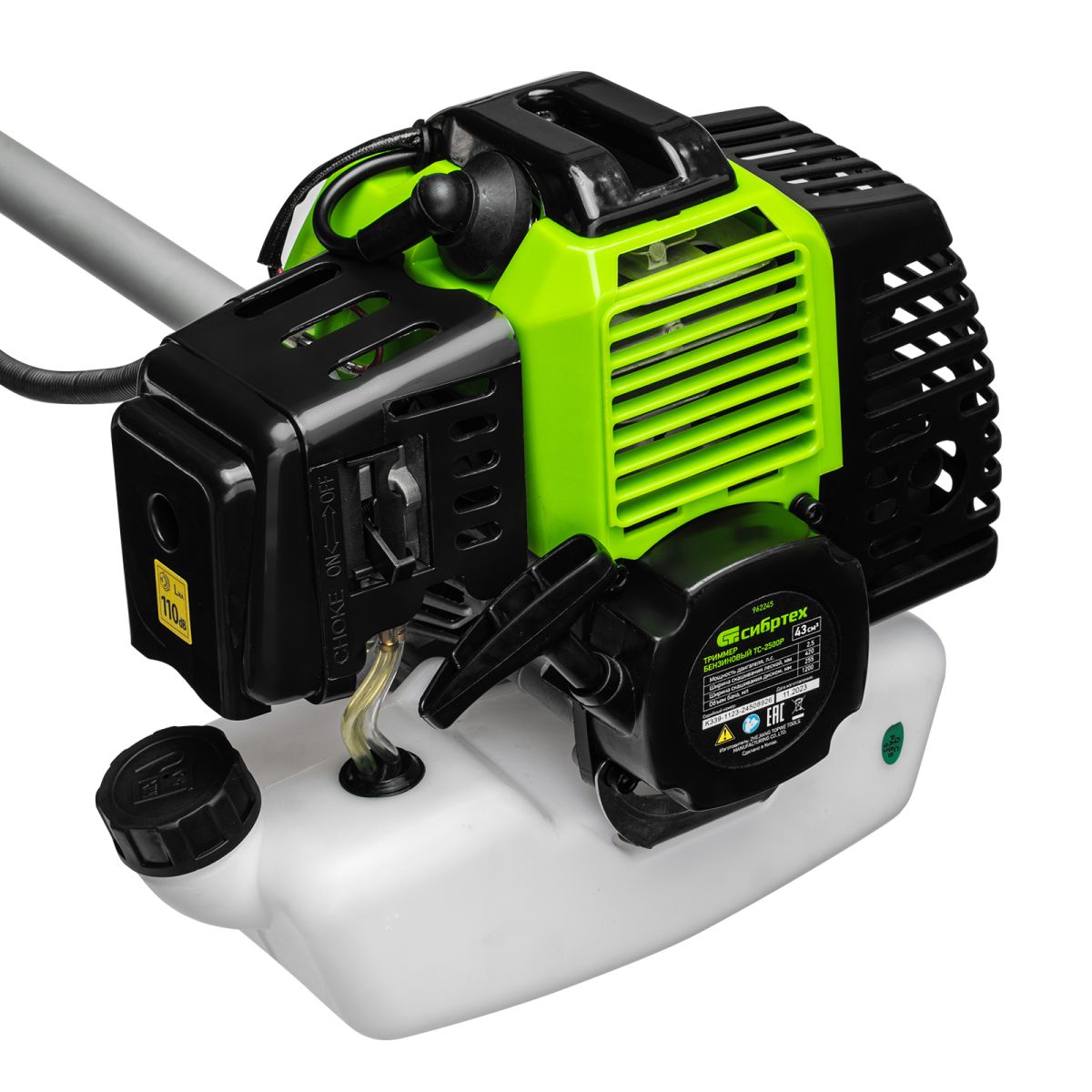 Триммер бензиновый Сибртех ТС-2500Р 962245 с двигателем объемом 43 см3 и разъемной штангой поставляется комплектом, состоящим из 2 частей. Используется для стрижки газонной травы и скашивания растительности. Входящий в комплект поставки трехлопастный нож позволяет легко справляться с густой, жесткой травой и толстыми стеблями сорняков. Оснастка вращается с частотой 9500 об/мин, ширина скашивания леской составляет 420 мм, ножом — 255 мм.
