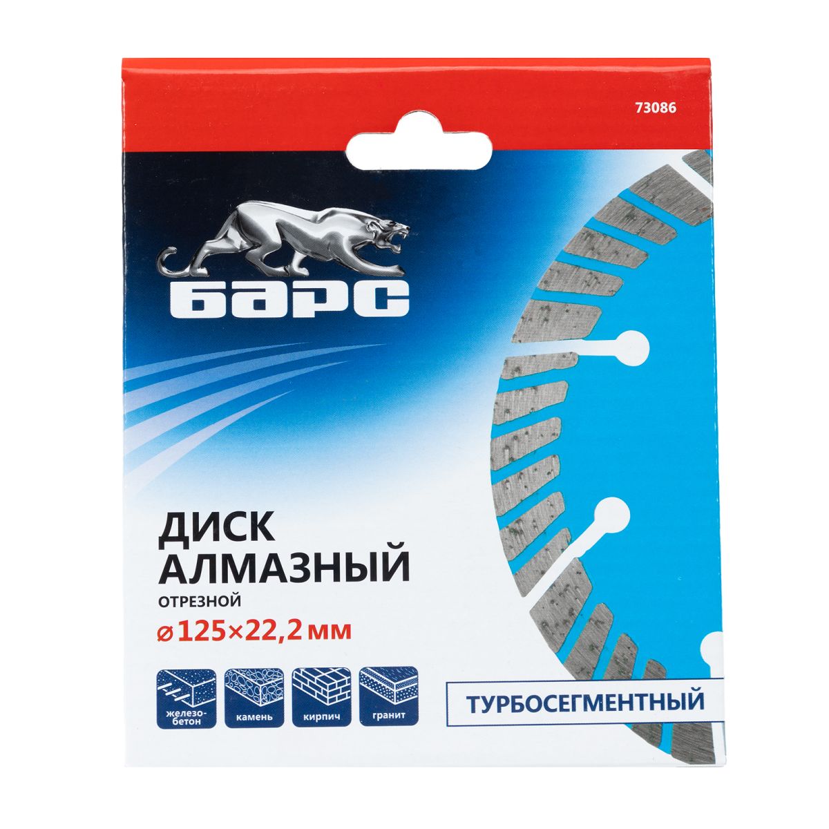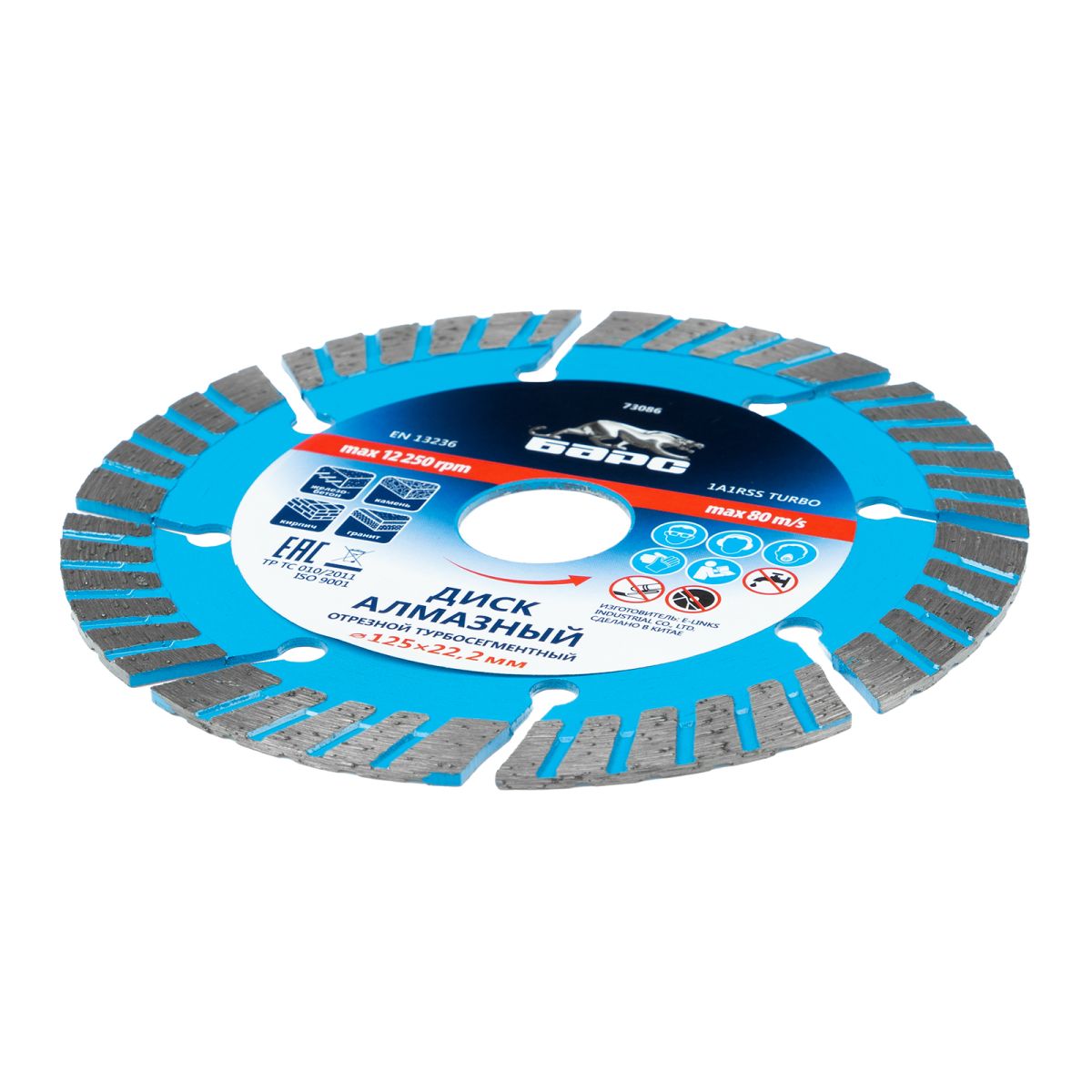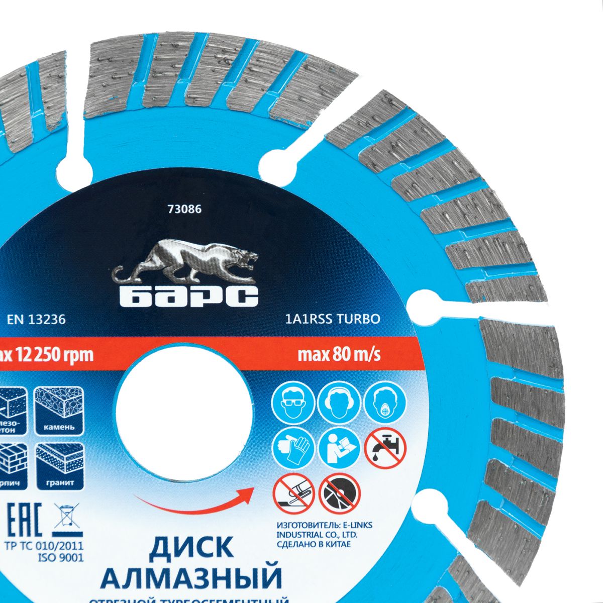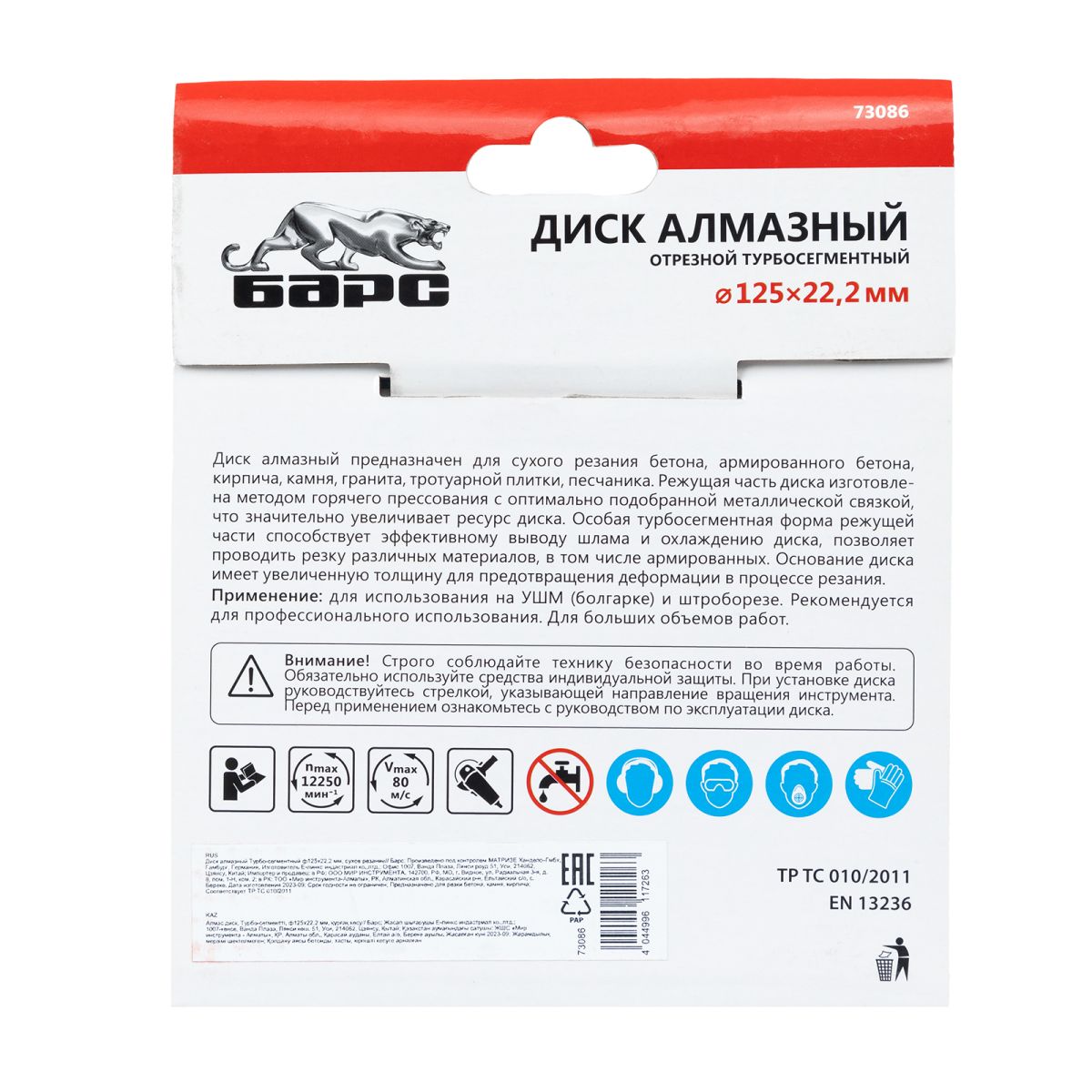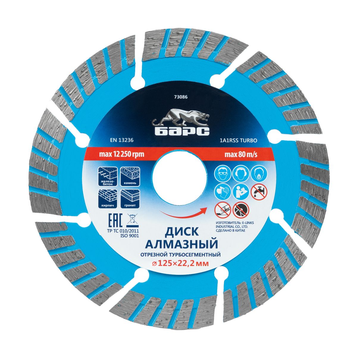 Турбо-сегментный алмазный диск Барс ф125х22,2 мм 73086 позволяет проводить сухое резание твердых материалов: камня, песчаника, кирпича, гранита, бетона, в т.ч. свежего и среднеармированного. Применяется в качестве расходного материала с УШМ. За счет турбо-сегментной конструкции диск быстро справляется с поставленными задачами и не требует водяного охлаждения.
