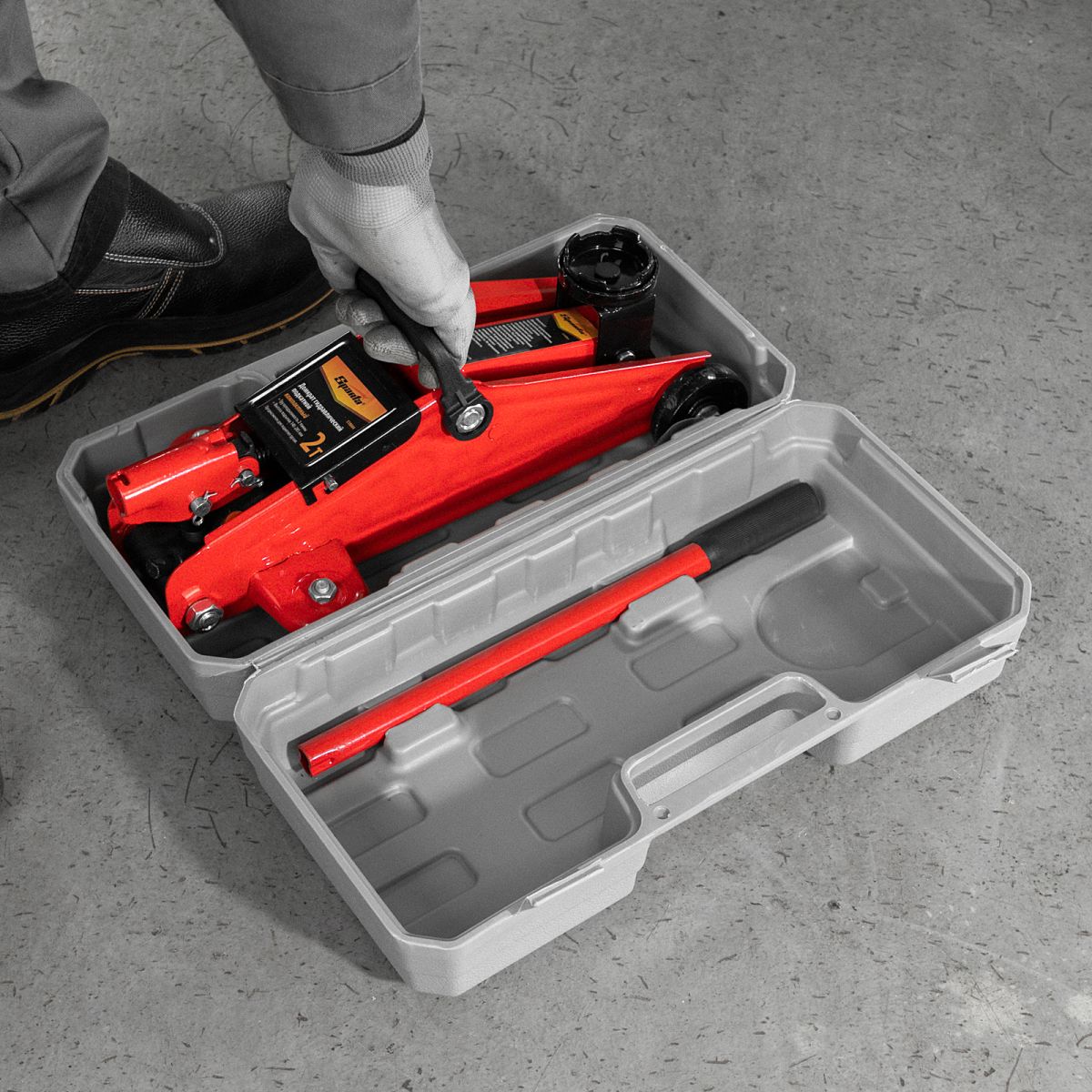 - Удобное хранение и транспортировка — домкрат поставляется в пластиковом кейсе.