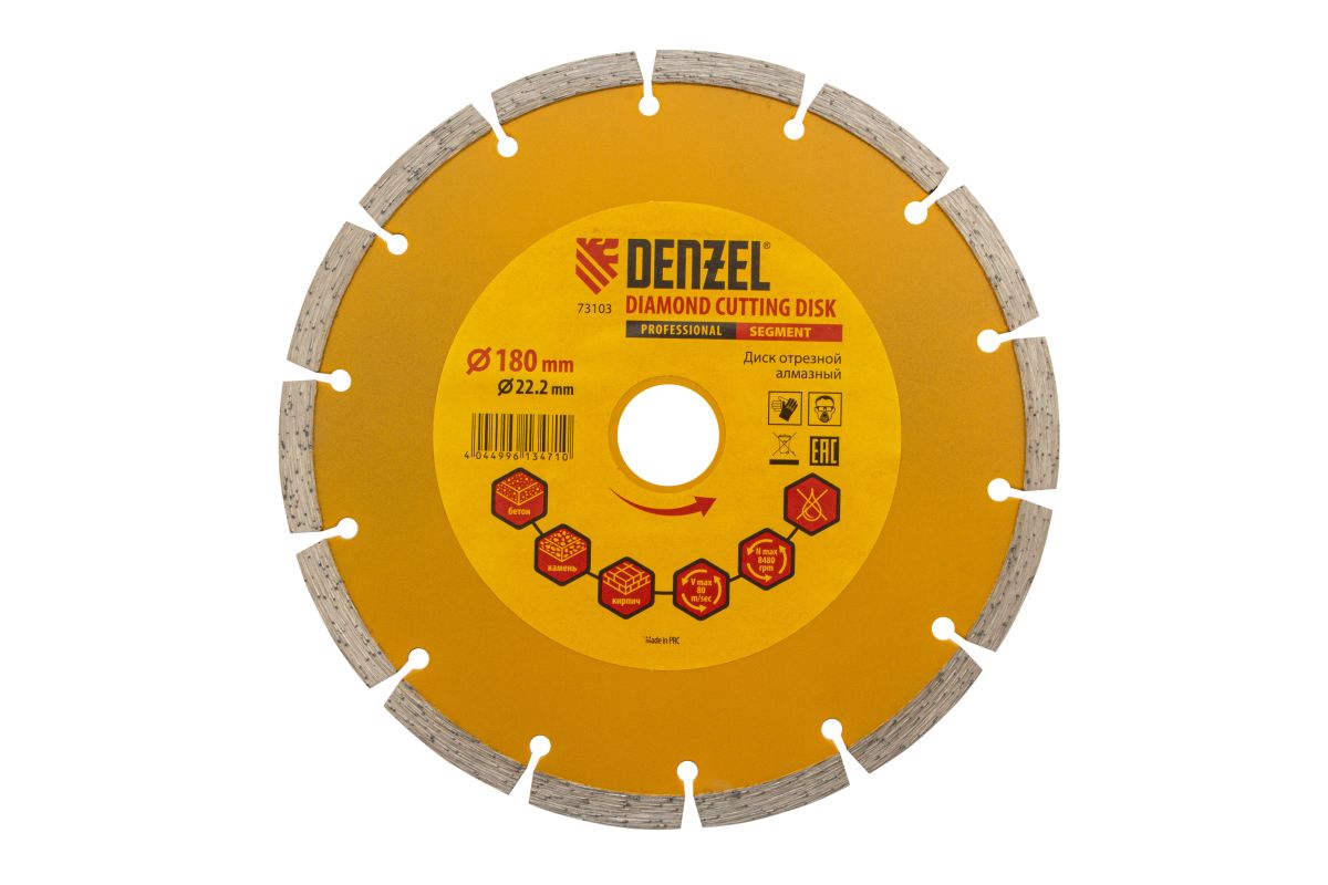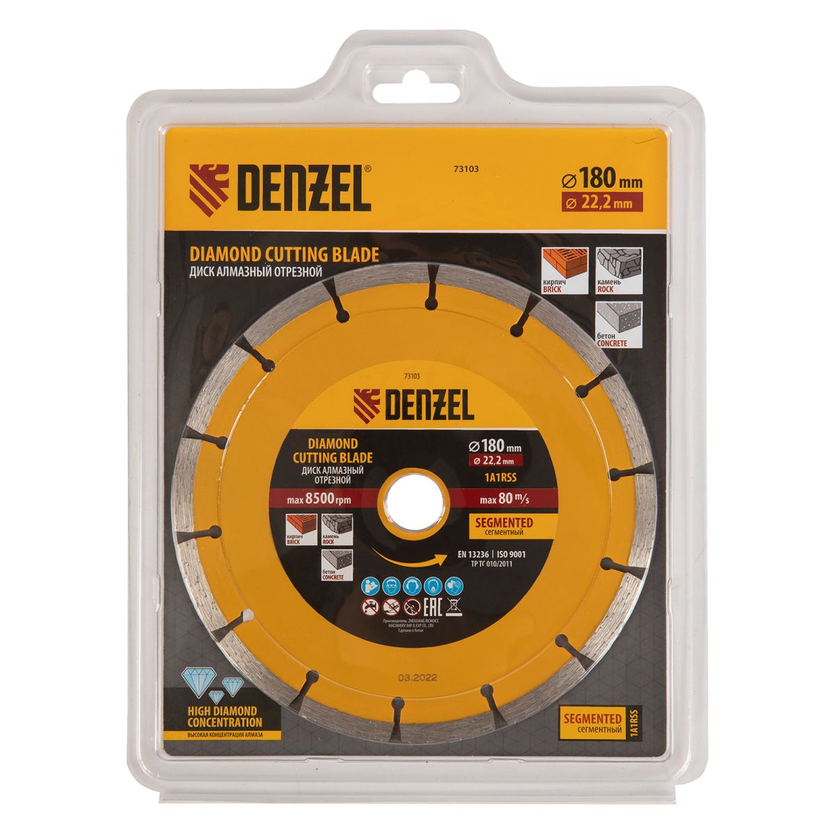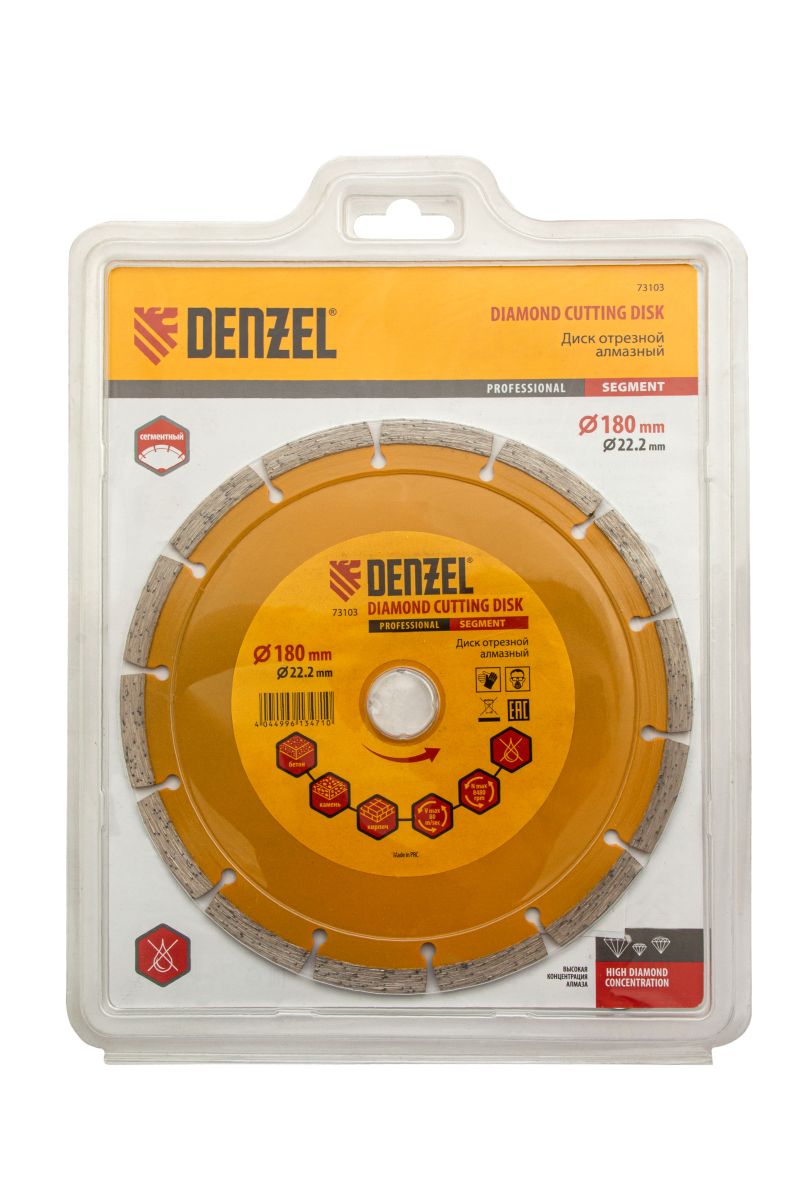 Отрезной сегментный алмазный диск Denzel 73103 диаметром 180 х 22,2 мм — оснастка для УШМ, использующаяся для сухой резки свежего и старого бетона, камня, кирпича, шлакоблока, мрамора, тротуарной плитки, гранита. Диск сегментного типа отличается высокой производительностью даже при интенсивных нагрузках. Подходит для бытового и профессионального использования.