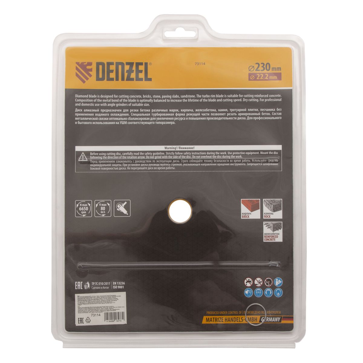 Отрезной алмазный диск Denzel Turbo 73114 диаметром 230 х 22,2 мм используется для сухой резки камня, кирпича, свежего и затвердевшего бетона, железобетона. Благодаря специальной форме испытывает уменьшенную нагрузку при резании материалов. Устанавливается на УШМ и применяется для проведения бытовых и профессиональных отрезных работ.
