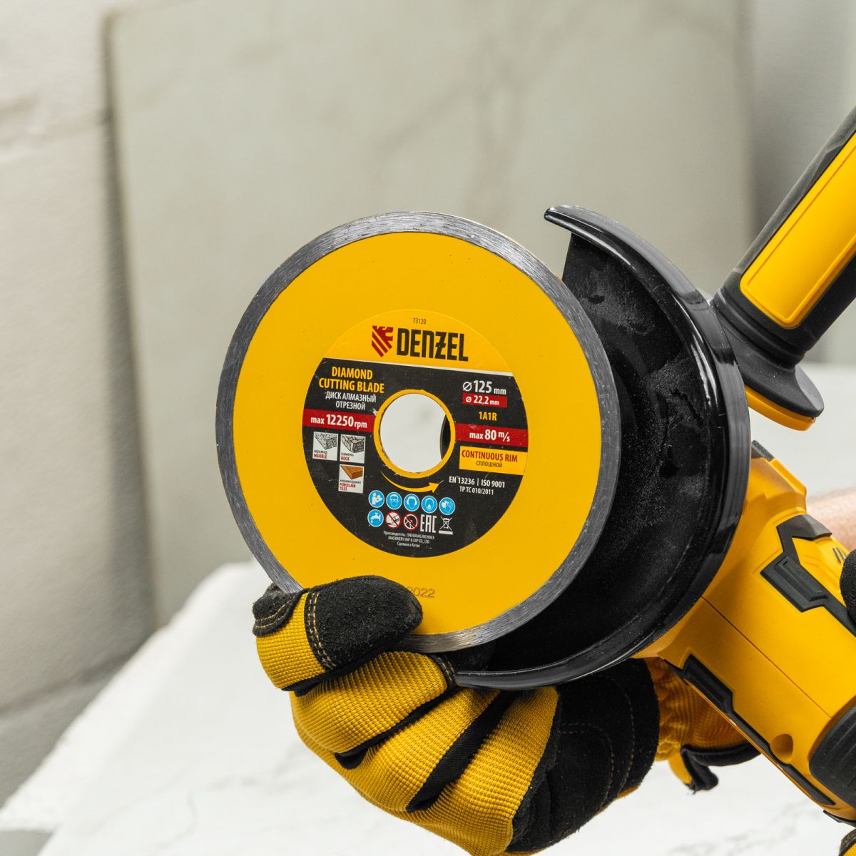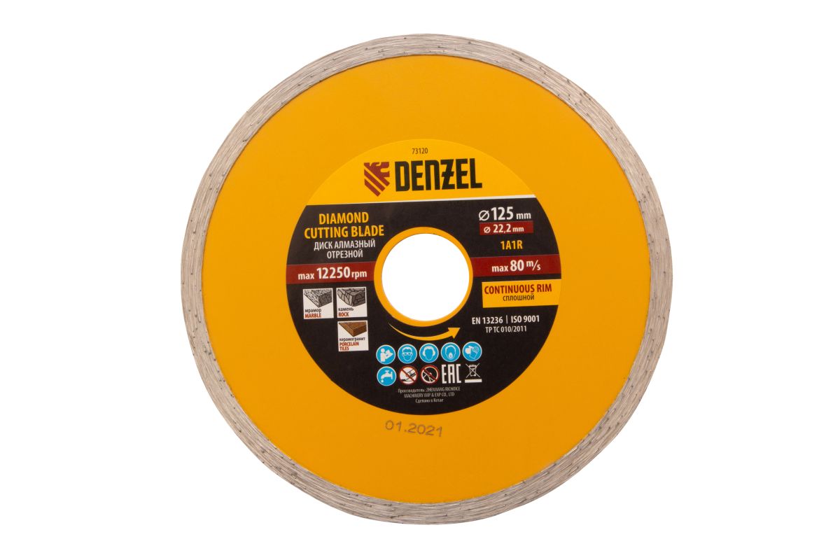 Отрезной алмазный диск Denzel «Сплошной» 73120 диаметром 125 х 22,2 мм используется для «мокрого» резания совместно с углошлифовальной машиной или плиткорезом с соответствующим посадочным диаметром. Режет камень, мрамор, керамогранитную и керамическую плитку. Диск отличается хорошей производительностью за счет высокой скорости реза, поэтому подходит для профессионального применения.