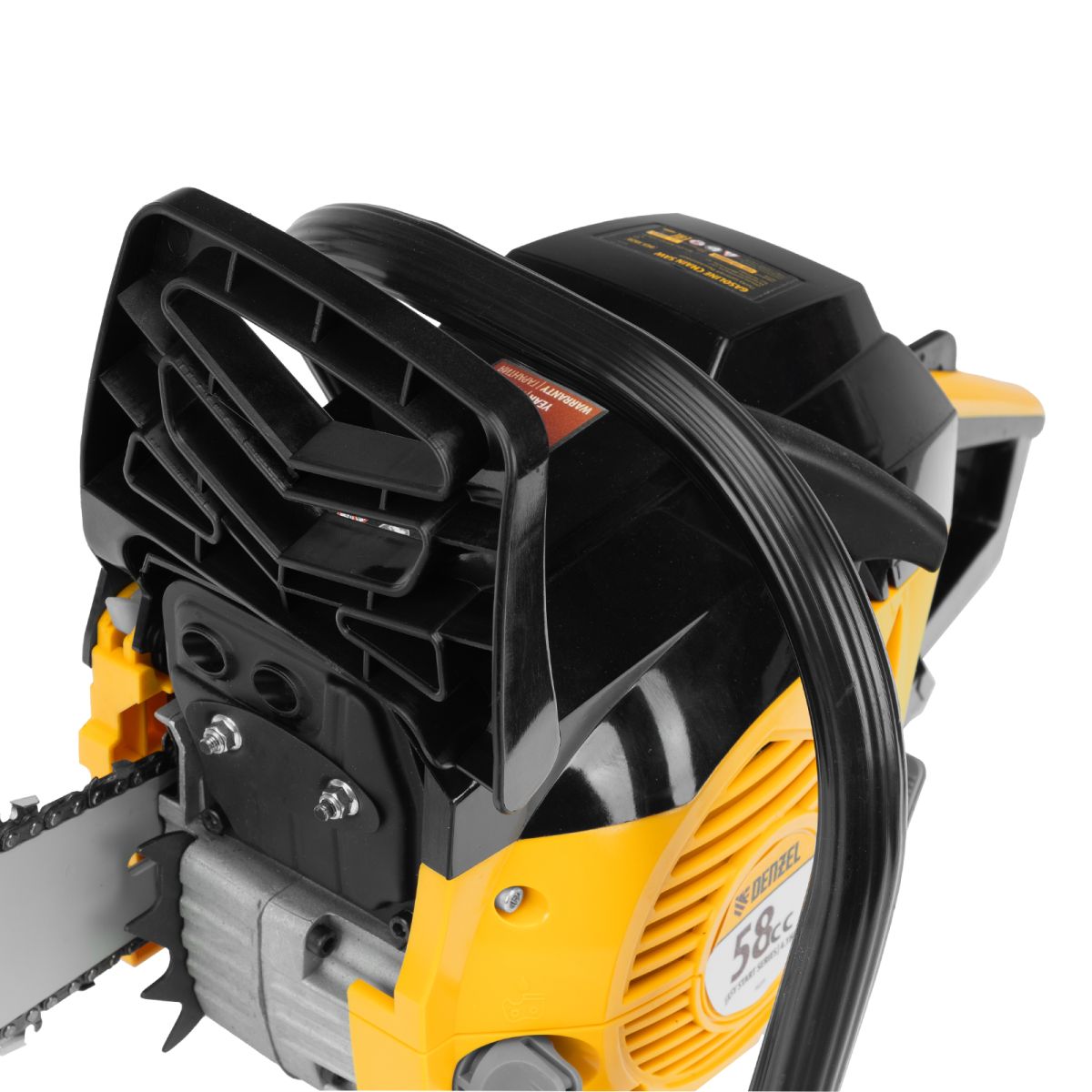 Пила цепная бензиновая Denzel DGS-5820 95235 с двигателем объемом 58 см3 и мощностью 4,1 л.с. поставляется с шиной длиной 50 см и цепью с 76 звеньями (шаг 0,325″, паз 1,5 мм). Это полупрофессиональный инструмент для заготовки дров, обрезки ветвей и сучьев в саду, распила древесины твердых и мягких пород. Пила выдерживает интенсивные нагрузки, используется во время строительных и ремонтных работ, будет полезна на дачном участке.