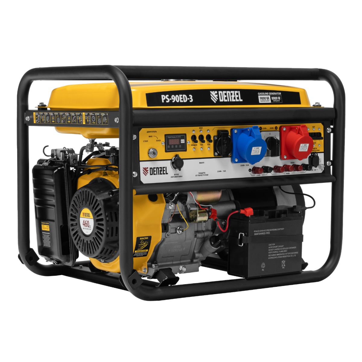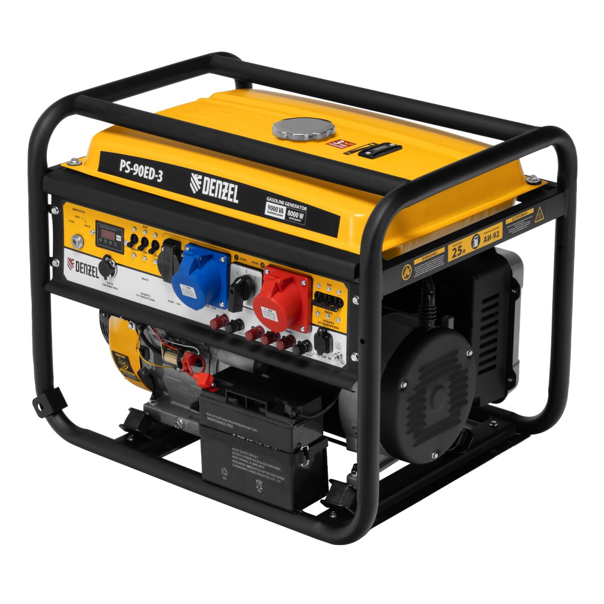 Бензиновый генератор Denzel PS 90 ED-3 946944 максимальной мощностью 9 кВт, с электростартером и баком объемом 25 л, имеющий функцию переключения режимов 230 В/400 В, — универсальное решение для строительной площадки или загородного дома. Классические трехфазные генераторы выдают полную мощность при работе в режиме 380 В. А в однофазном режиме — только треть. Но модель PS 90 ED-3 отличается возможностью выбора режима: на панели управления имеется переключатель 230В/400В. Генератор способен работать как с трехфазными потребителями, так и с однофазными без потери мощности. Продолжительность непрерывной работы без дозаправки составляет почти 7 часов.
