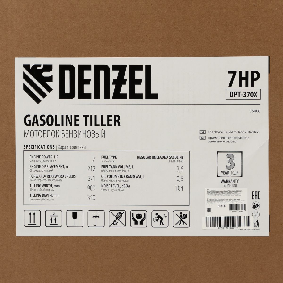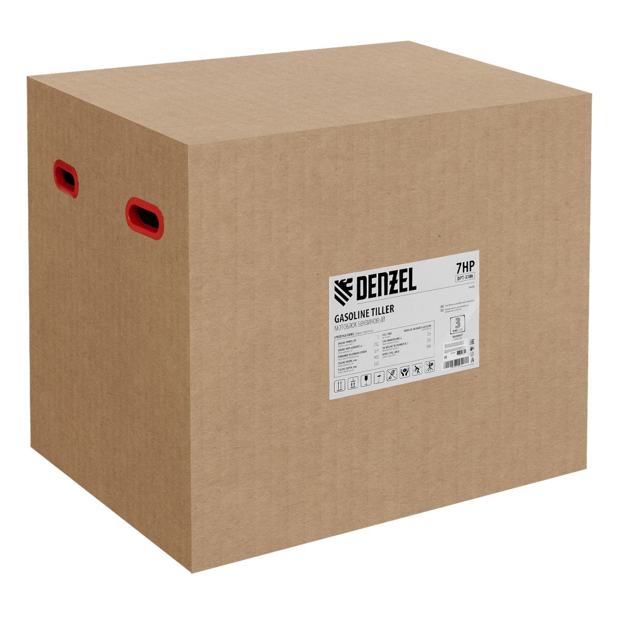 Мотоблок Denzel 56406 DPT-370X мощностью 7 л.с., с дисковым сцеплением, фрезами 3 х 4, валом отбора мощности (ВОМ), передачами 3В/1Н, имеет ширину вспахивания 90 см и глубину обработки 35 см. Предназначен для обработки почвы: рыхления, боронования, выравнивания, прополки и выполнения других задач на приусадебных и садовых участках, уверенно справляется с плотной глинистой почвой.,Мощный и экономичный одноцилиндровый четырехтактный двигатель Denzel серии Long Life с рабочим объемом 212 см3 отличается надежностью и продолжительным ресурсом. Многодисковый механизм сцепления обеспечивает передачу высокого крутящего момента на колеса. Мотоблок предназначен для работы на большой территории и широко используется в быту.