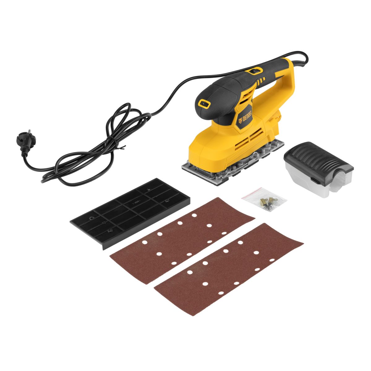 - Полная готовность к работе — в комплект входит пластина для прокалывания шлифбумаги, запасные угольные щетки и шлифовальное полотно.