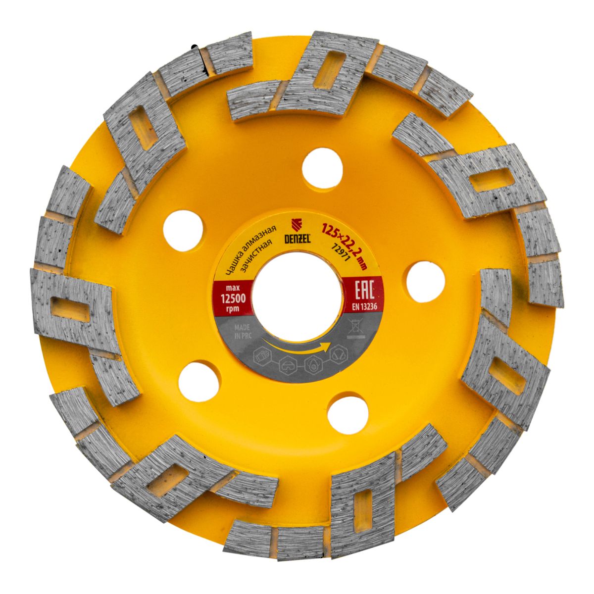 Алмазная зачистная чашка Denzel «Волна» 72971 диаметром 125 мм и посадочным отверстием 22,2 мм — оснастка для углошлифовальных машин. Подходит для чернового шлифования бетонных, каменных, кирпичных, мраморных и гранитных поверхностей. В этом случае для удаления наплывов, зачистки стыков и швов потребуется несколько проходов. Чашку также используют для придания гладкости обрабатываемой поверхности — алмазные сегменты особой формы легко справляются с мелкими неровностями, работая мягко и плавно. Высокая плотность алмазов в рабочем слое и оптимально подобранная связка обеспечивают эффективность насадки при обработке различных материалов. Чашка рекомендована для профессионального использования.