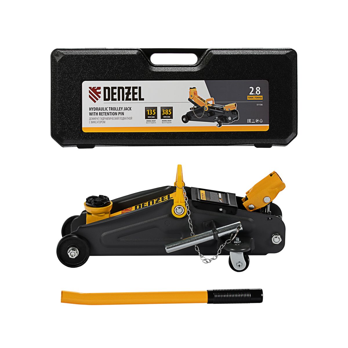 Гидравлический подкатной домкрат с фиксатором Denzel 51156, с высотой подхвата 135 мм, предназначен для плавного подъема грузов массой до 2,8 т на высоту до 385 мм. Страховочный штифт позволяет фиксировать подъемный рычаг на высоте 305 и 370 мм для безопасной работы. Домкрат пригодится владельцам легковых автомобилей со стандартным клиренсом.