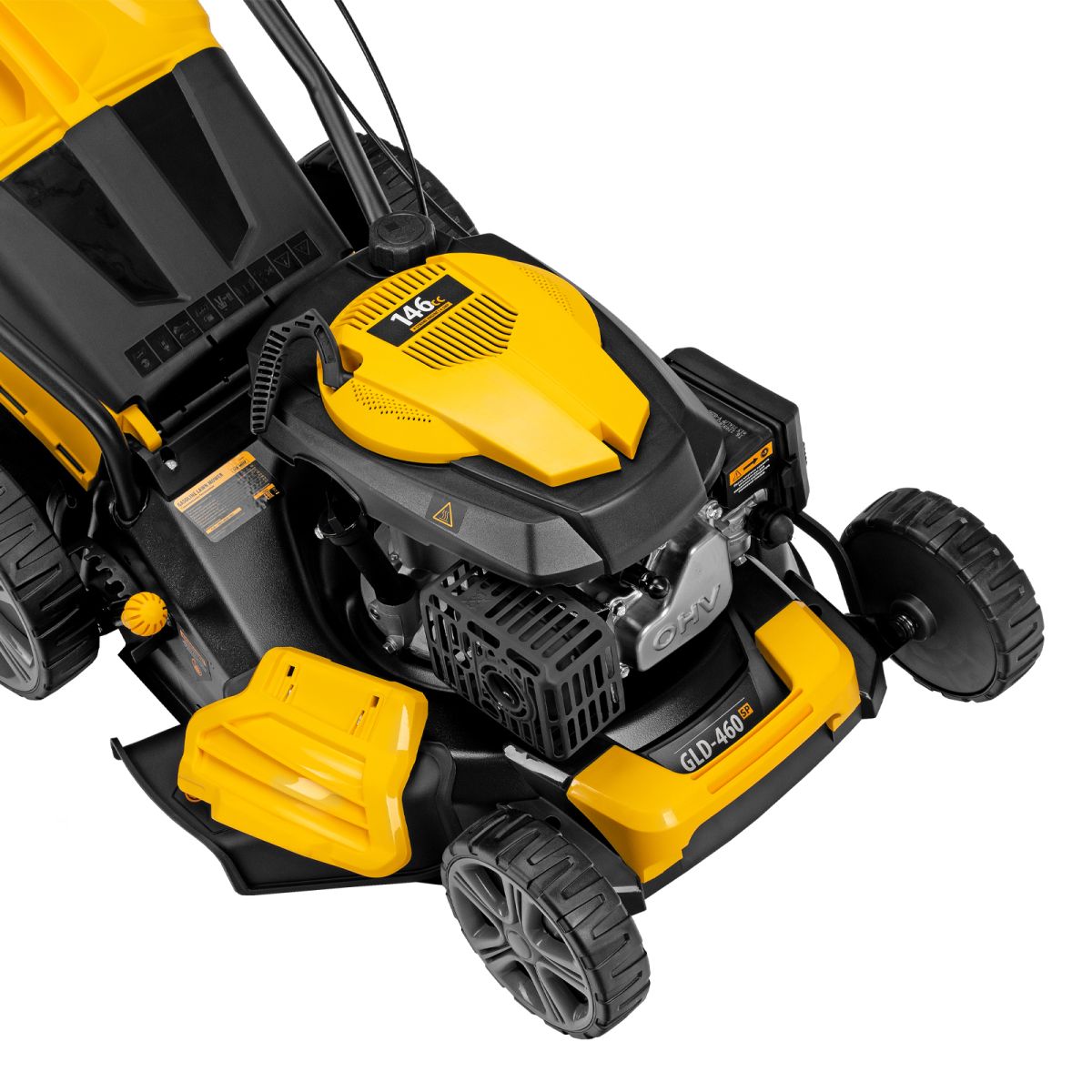 Газонокосилка бензиновая Denzel GLD-460SP 58803 с двигателем объемом 146 см3, с приводом, отличается шириной прохода 46 см, имеет 7 уровней скашивания и оборудована травосборником на 50 л. Предназначена для срезания и мульчирования травы на приусадебном участке. Усиленная дека, увеличенный диаметр колес и прочный нож обеспечивают эффективное окашивание сложной территории с зарослями и стеблями. При систематическом применении газонокосилка предотвращает распространение сорняков на участке.