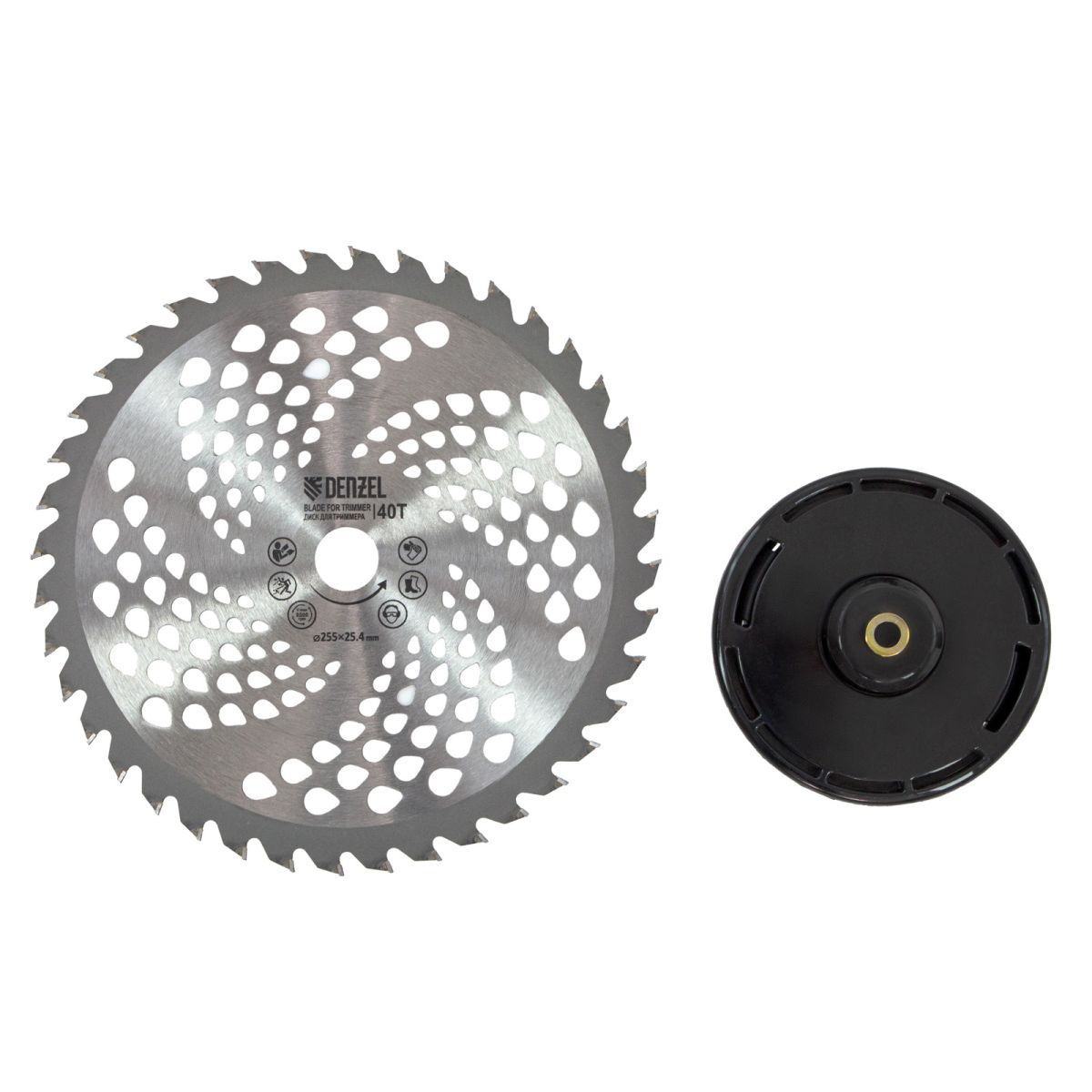 - Дополнительные возможности — можно приобрести диски Denzel 96323, 96325 для быстрого удаления растительности с жесткими стеблями (полыни, крапивы, лебеды), 96328 для скашивания молодых побегов кустарника диаметром до 3 мм.