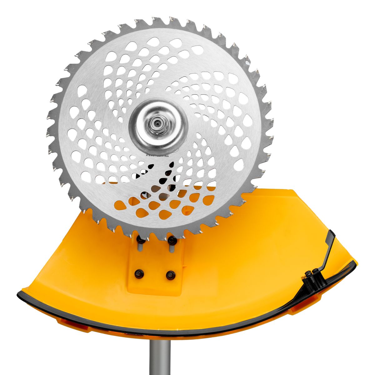 - Дополнительные возможности — можно приобрести диски Denzel 96323, 96325 для быстрого удаления растительности с жесткими стеблями (полыни, крапивы, лебеды) или 96328 для скашивания молодых побегов кустарника диаметром до 3 мм.
