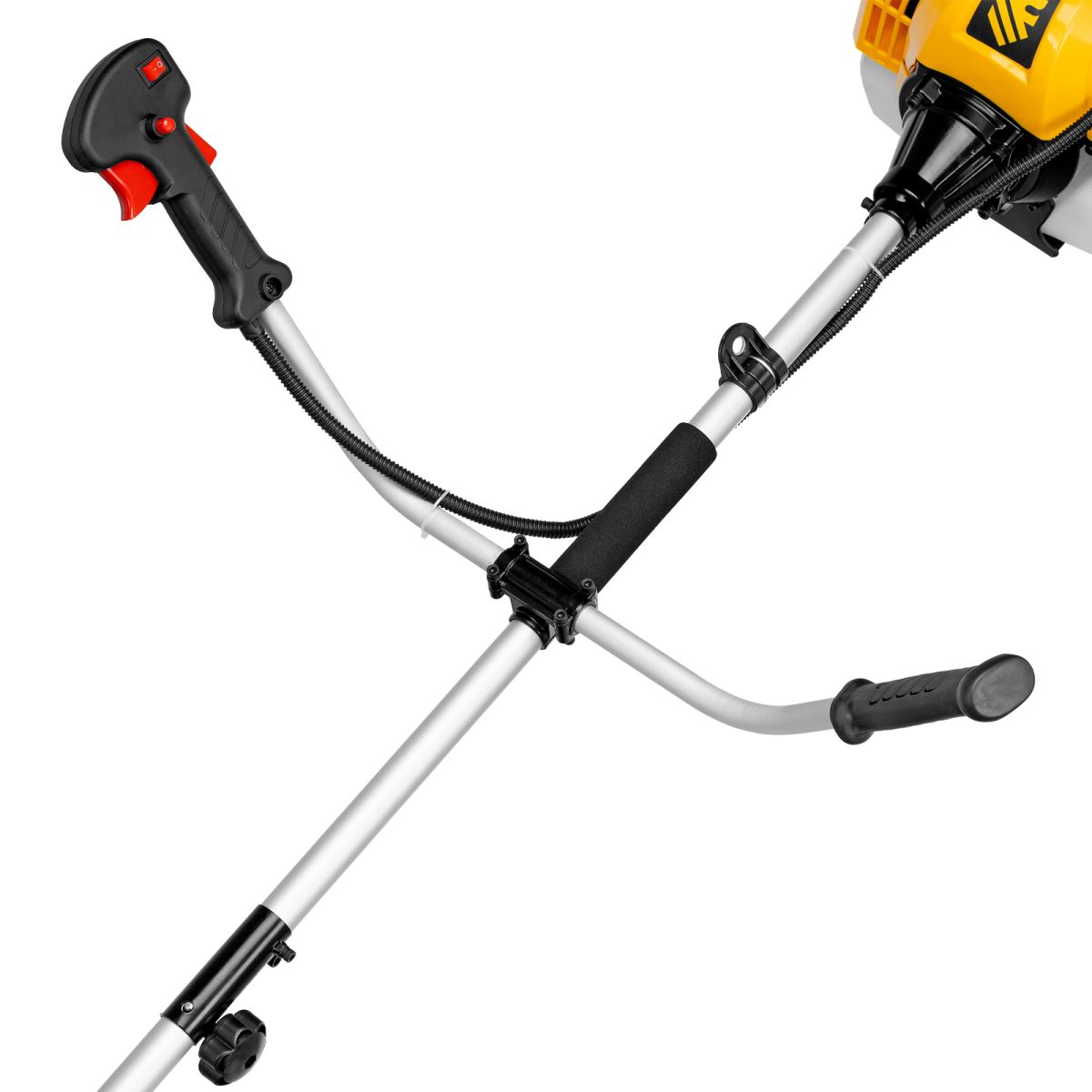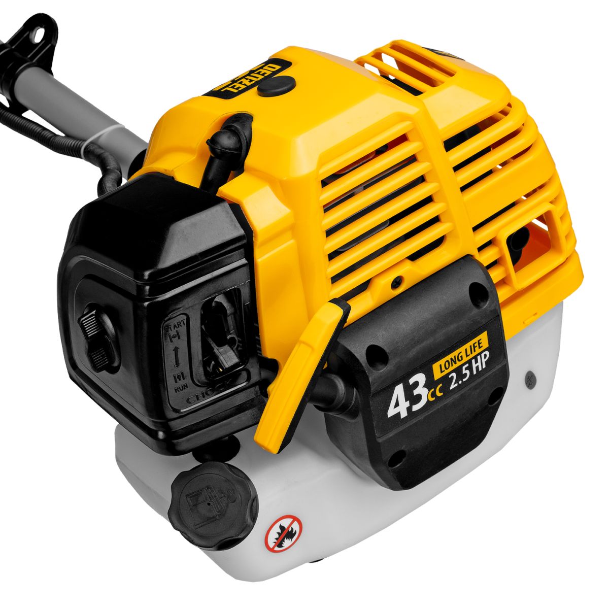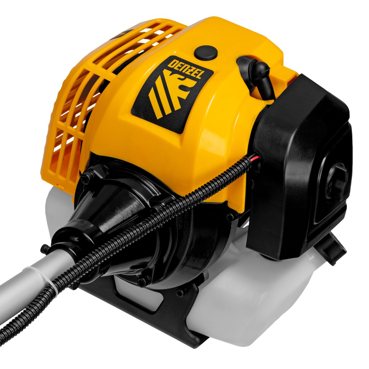 Бензиновый триммер Denzel DT-43S 96225 с двигателем объемом 43 см³ и мощностью 2,5 л.с., с разъемной штангой, состоит из 2 частей. Используется для подравнивания газона, скашивания травы всех типов, в том числе с жесткими древовидными стеблями (полыни, крапивы, лебеды, борщевика), а также срезания кустарника и молодых побегов деревьев с диаметром стволов до 10 мм. Это оптимальный вариант для работы в труднодоступных местах: вокруг насаждений, вдоль садовых дорожек, возле стен дома и т. д. Мощный двухтактный двигатель обеспечивает высокую частоту вращения оснастки 9500 об/мин. Ширина скашивания диском составляет 25,5 см, леской — 42 см.