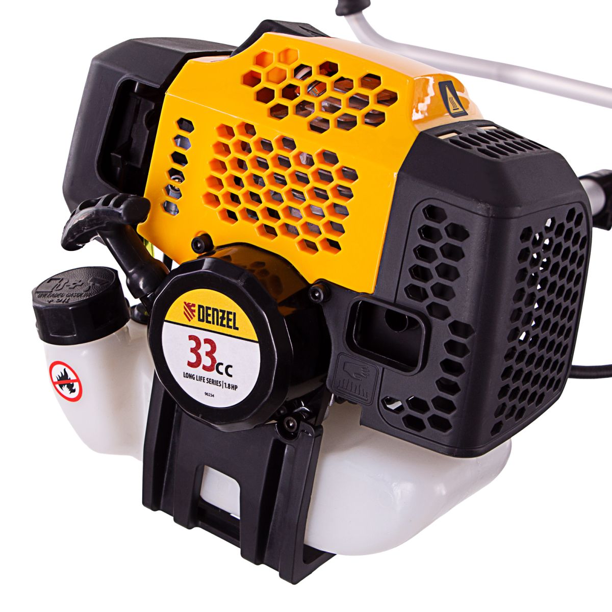 Бензиновый триммер Denzel DGT-330 93234 с двигателем объемом 33 см3 и мощностью 1,8 л. с., с неразъемной штангой, состоит из 2 частей. Комплектуется усиленной катушкой из полиамида, трехлопастным ножом и пильным диском. Предназначен для подравнивания газона, скашивания травы различных типов, в том числе с жесткими стеблями (полыни, крапивы, лебеды), а также срезания борщевика, кустарника и молодых побегов деревьев с диаметром стволов до 10 мм. Удобен для работы в местах, недоступных для колесной косилки.