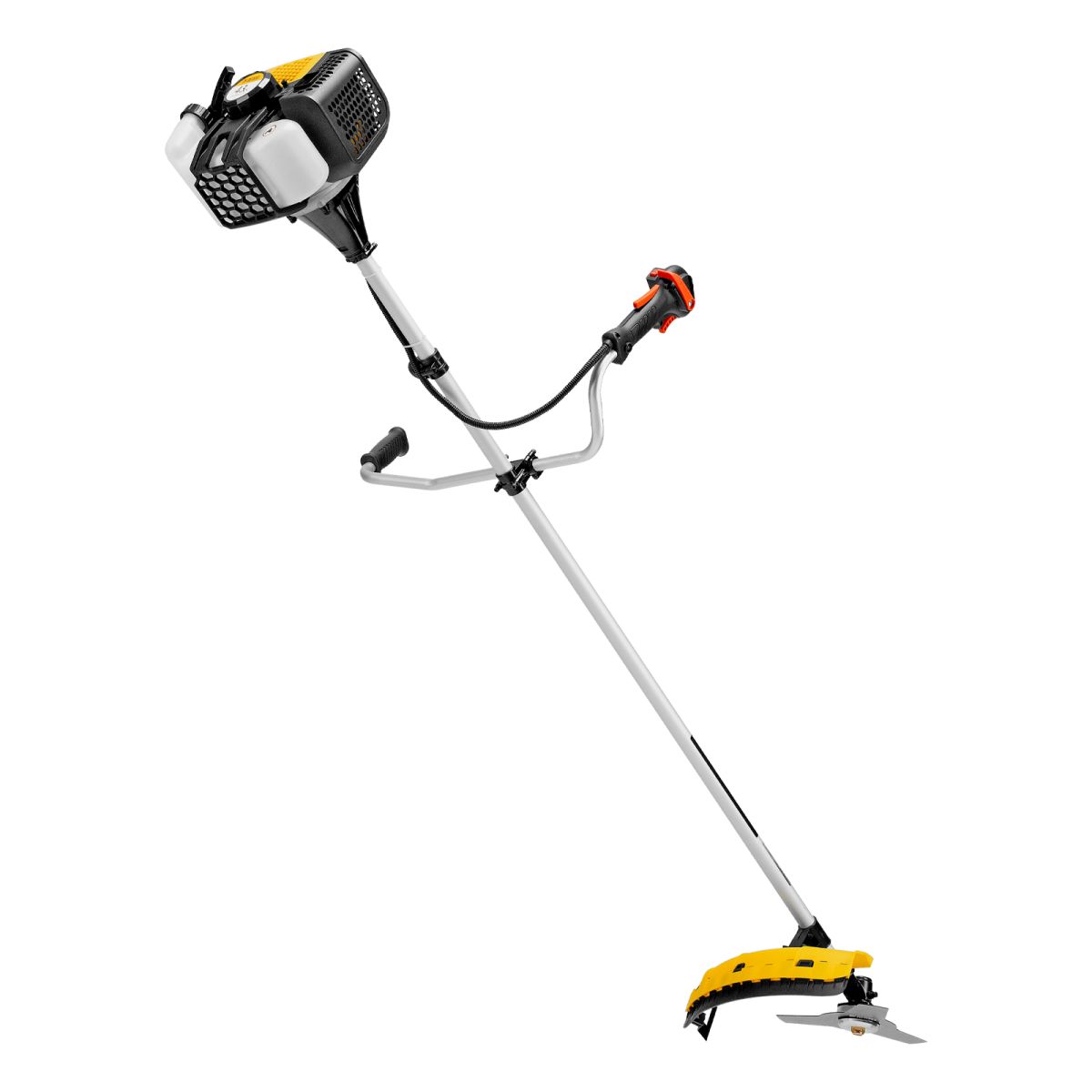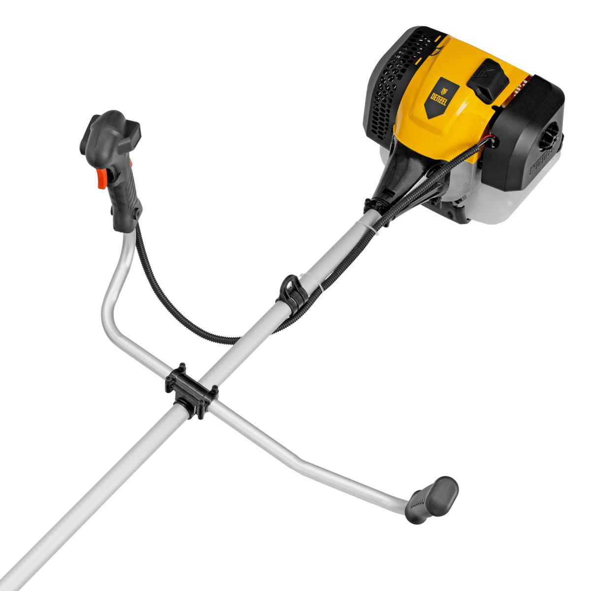 Бензиновый триммер Denzel DGT-430 96236 с двигателем объемом 43 см3 и мощностью 2,5 л.с., с неразъемной штангой, состоит из 2 частей. Предназначен для скашивания густой травой и создания аккуратных лужаек, подходит для скашивания травы всех типов, в том числе с жесткими древовидными стеблями (полыни, крапивы, лебеды, борщевика), а также срезания кустарника и молодых побегов деревьев с диаметром стволов до 10 мм. Подходит для мест, в которых с обычными газонокосилками работать тяжело. Экономичный двигатель позволяет эффективно обрабатывать участок площадью до 9-10 соток.,В комплект поставки входят режущие насадки: усиленная полиамидная катушка, трехлопастный нож и пильный диск.