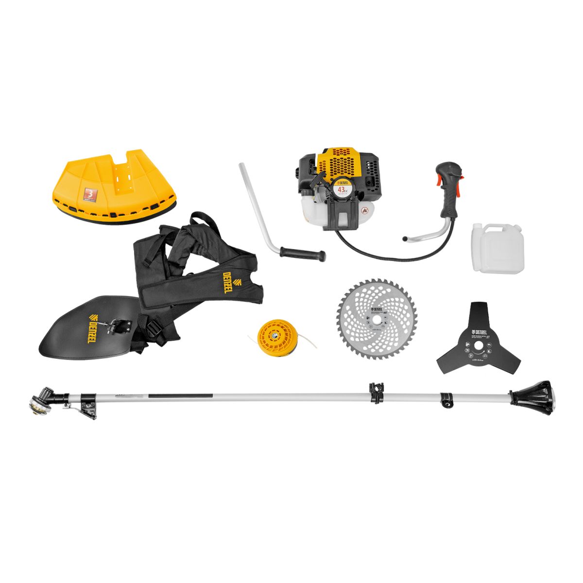 Триммер бензиновый - 1 штКатушка - 1 штНож трехлопастной 3Т - 1 штПильный диск 40Т - 1 штДвухплечевая подвесная система с защитой бедра - 1 штДозатор для приготовления смеси - 1 штНабор крепежа - 1 штНабор инструментов - 1 штРуководство по эксплуатации с гарантийным талоном - 1 штДозатор для приготовления топливной смеси - 1 штЛеска диаметром 2 мм - 1 шт