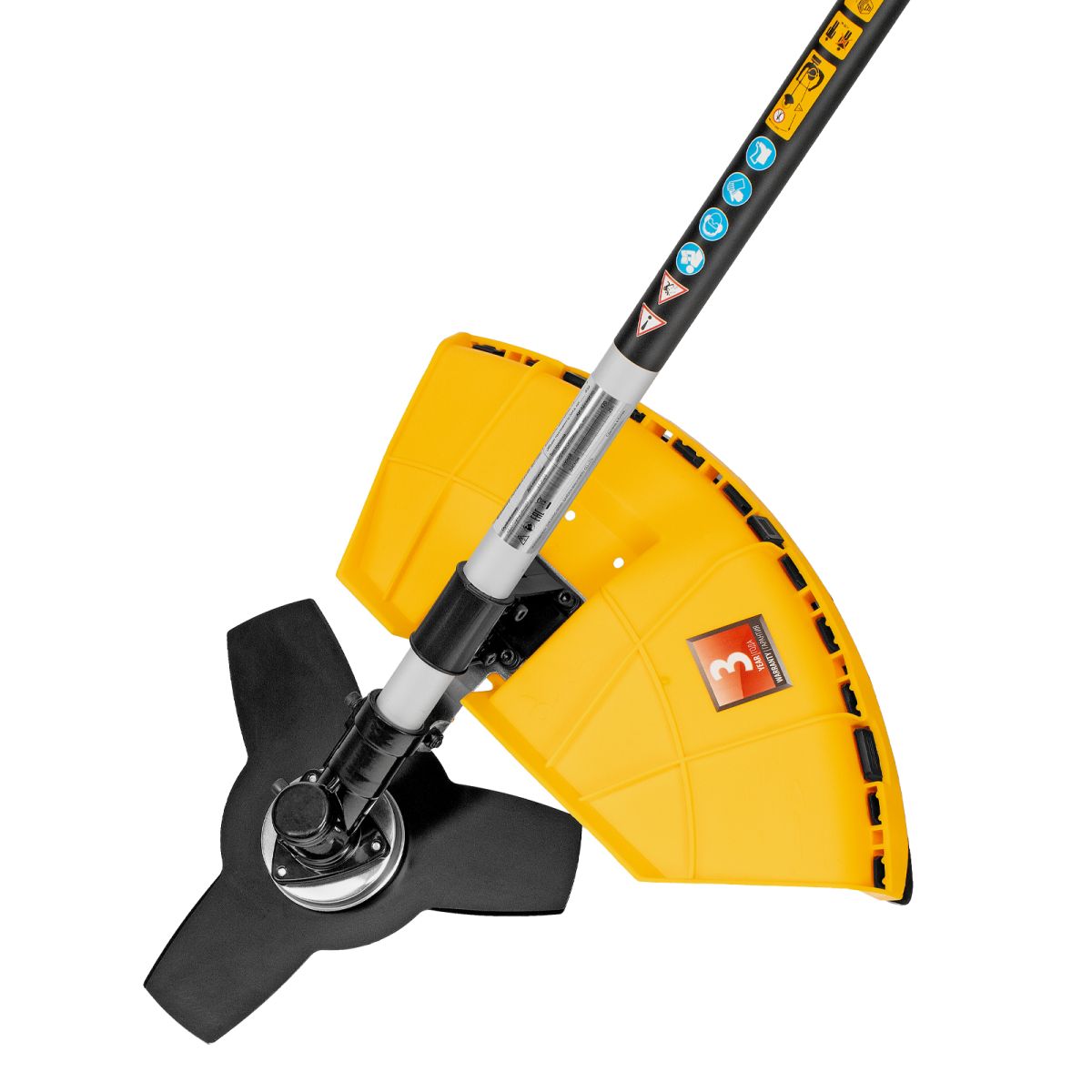 - Безопасность — пластиковый кожух защищает пользователя от вылетающих твердых частиц, травы и камней.