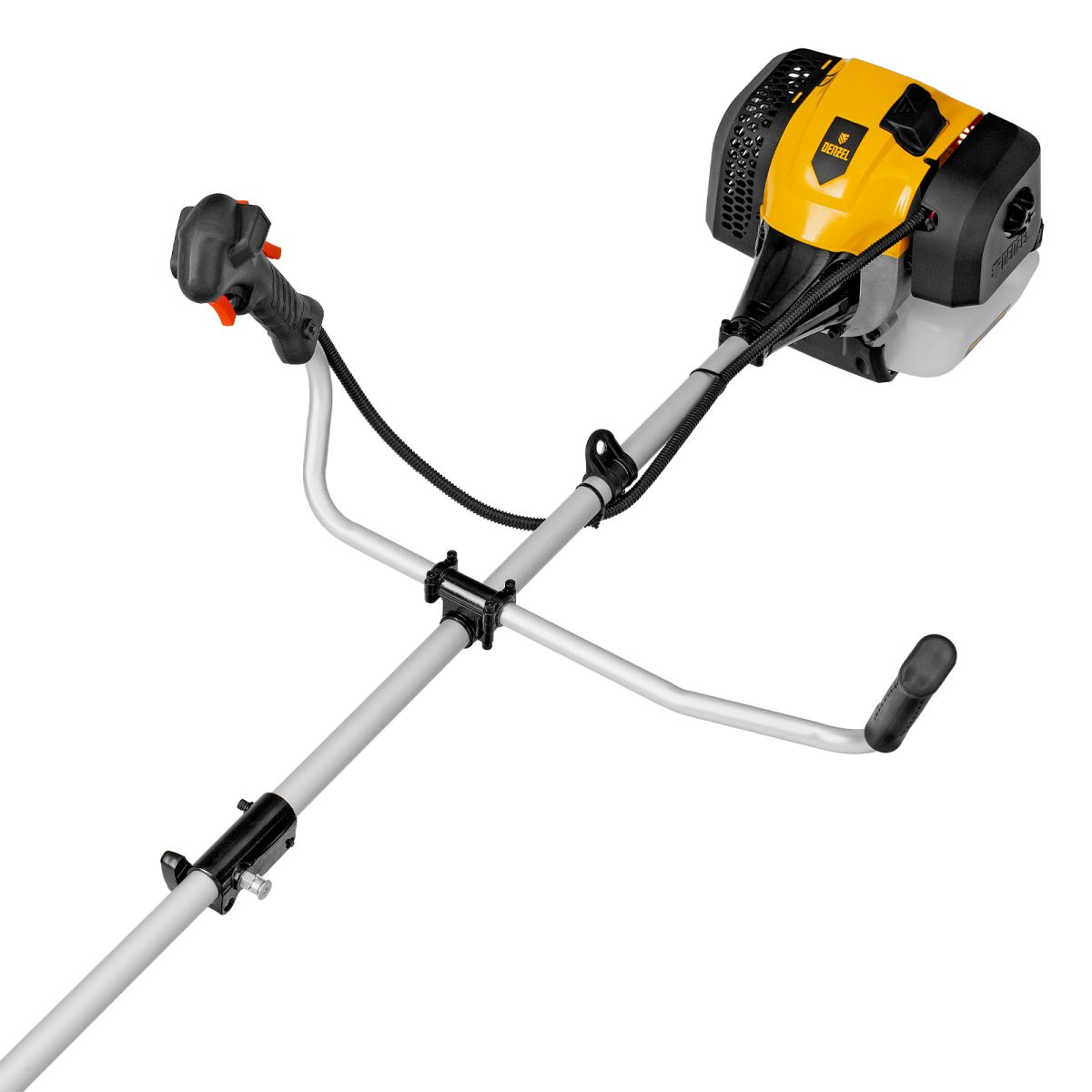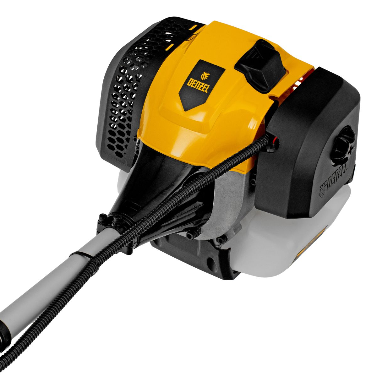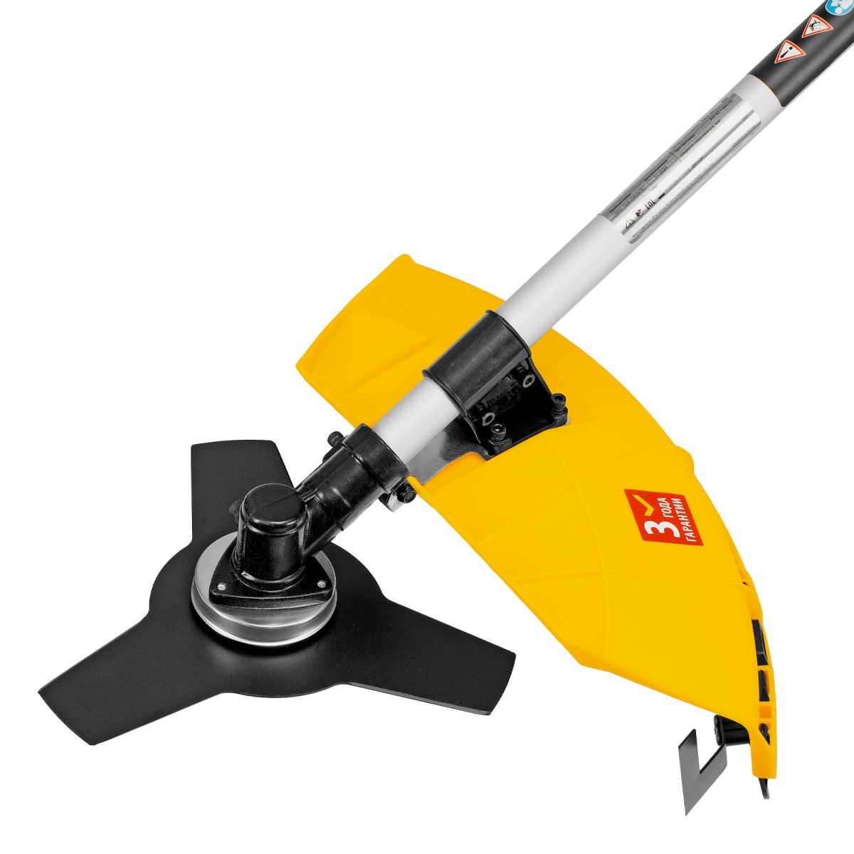 Бензиновый триммер Denzel DGT 430S 96237 с двигателем объемом 43 см3, мощностью 2,5 л. с., с разъемной штангой, состоит из 2 частей. Оптимально подходит для ухода за газоном, скашивания травы всех типов, в том числе с жесткими стеблями (полыни, крапивы, лебеды), борьбы с борщевиком, а также срезания кустарника и молодых побегов деревьев с диаметром стволов до 10 мм. Триммером удобно работать в недоступных для колесной газонокосилки мест: вокруг деревьев, около стен и заборов, у кромок дорожек. Экономичный двигатель мощностью 2,5 л.с. отличается высоким ресурсом и долговечностью. Триммер комплектуется 3 оснастками: усиленной полиамидной катушкой, трехлопастным ножом и пильным диском.