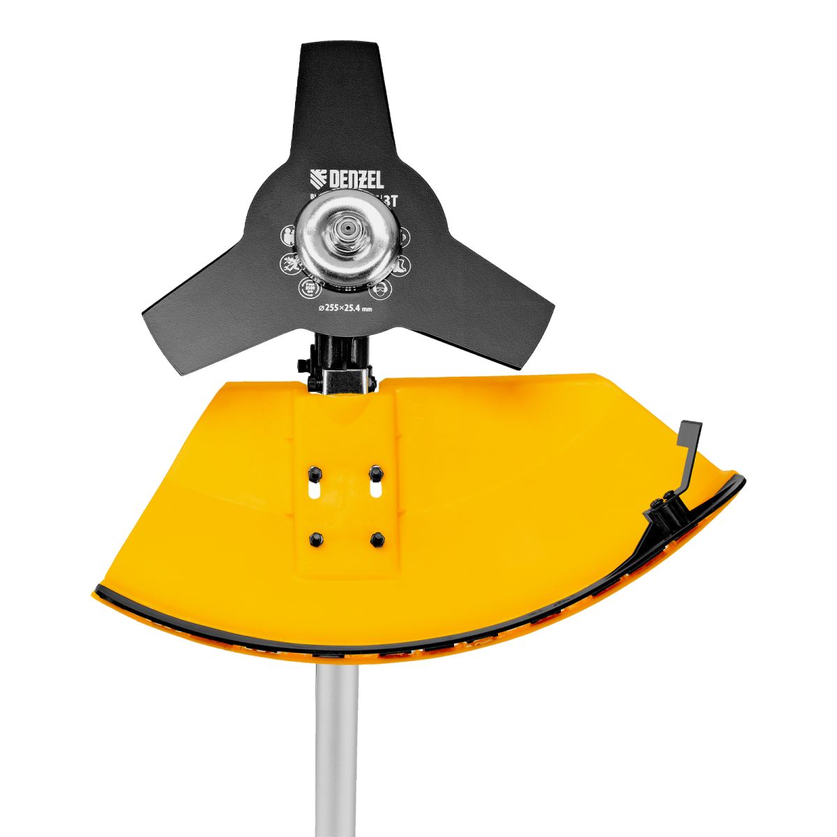 - Дополнительные возможности — можно приобрести и установить на триммер диск Denzel 96323 для быстрого удаления растительности с жесткими стеблями, 96328 для скашивания молодых побегов кустарника диаметром до 3 мм.