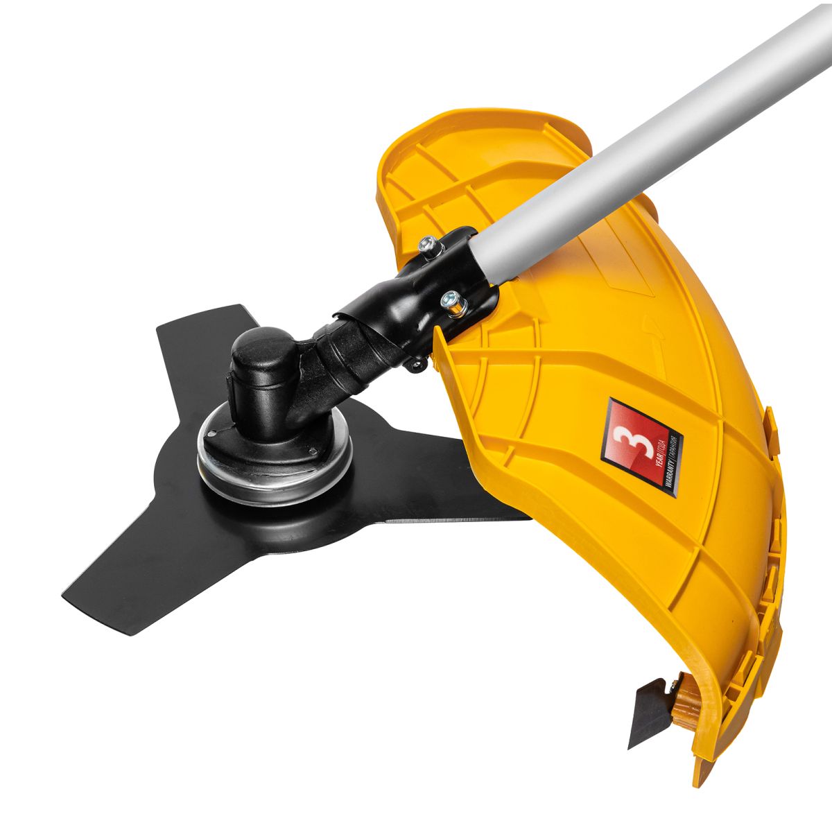 - Безопасная эксплуатация — прочный кожух, закрывающий оснастку, защищает пользователя от летящей травы, грязи и мелких камней.