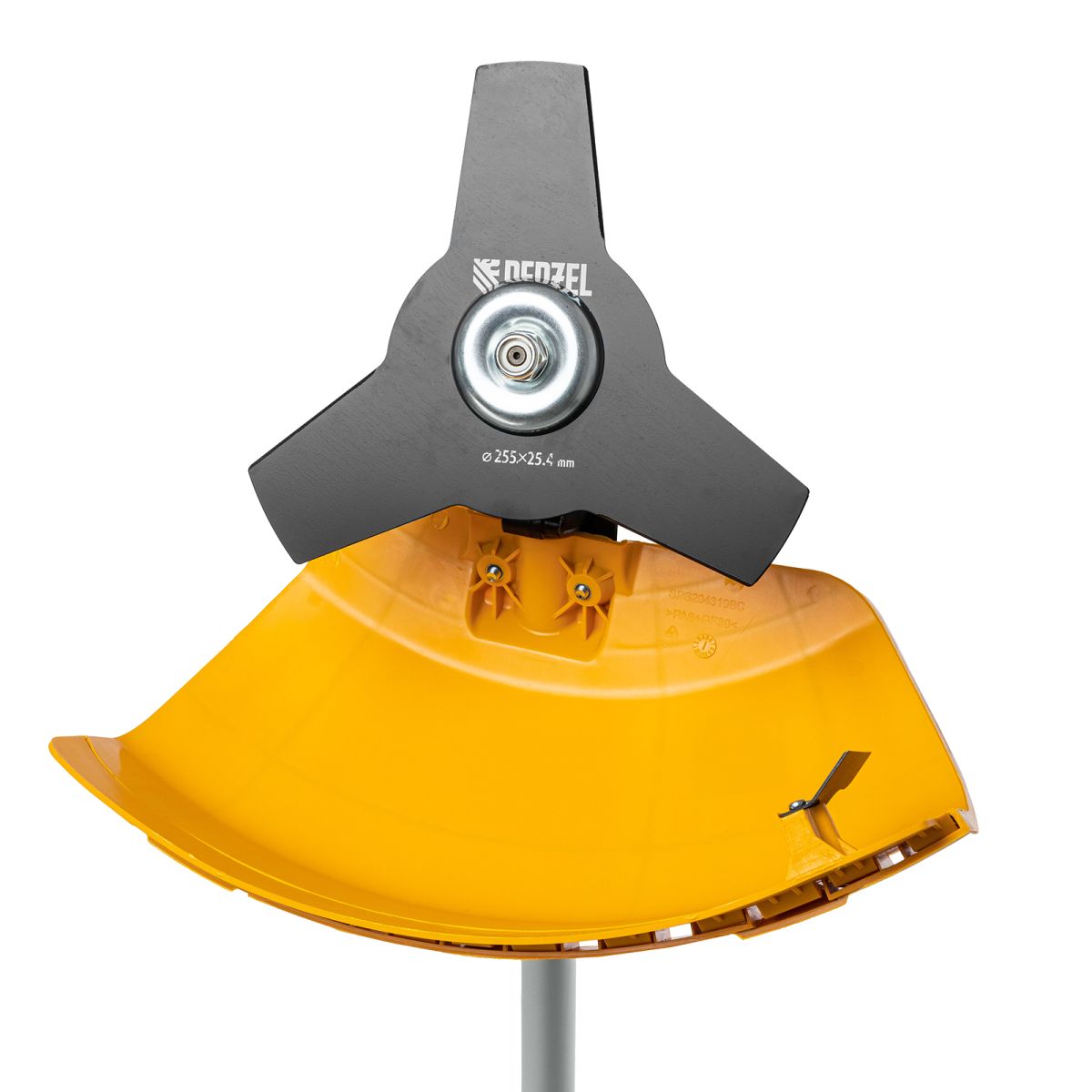 - Дополнительные возможности — можно приобрести диск Denzel 96323 с шириной скашивания 230 мм для быстрого удаления растительности с жесткими стеблями, 96328 для скашивания молодых побегов кустарника диаметром до 3 мм, 96340 для срезания борщевика, кустарника и молодых побегов деревьев с диаметром стволов до 10 мм.