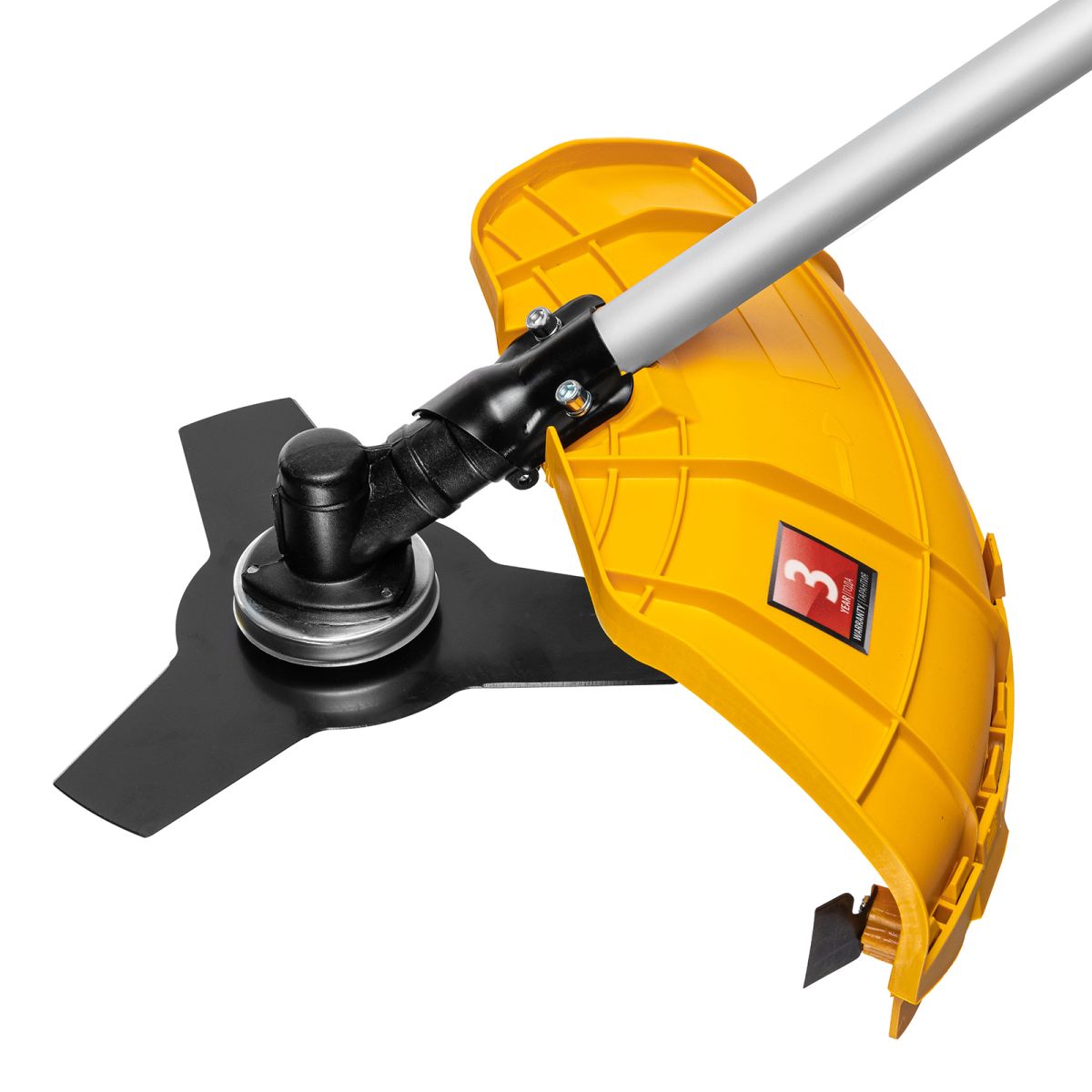 - Безопасная эксплуатация — прочный кожух, закрывающий оснастку, защищает пользователя от летящей травы, грязи и мелких камней.