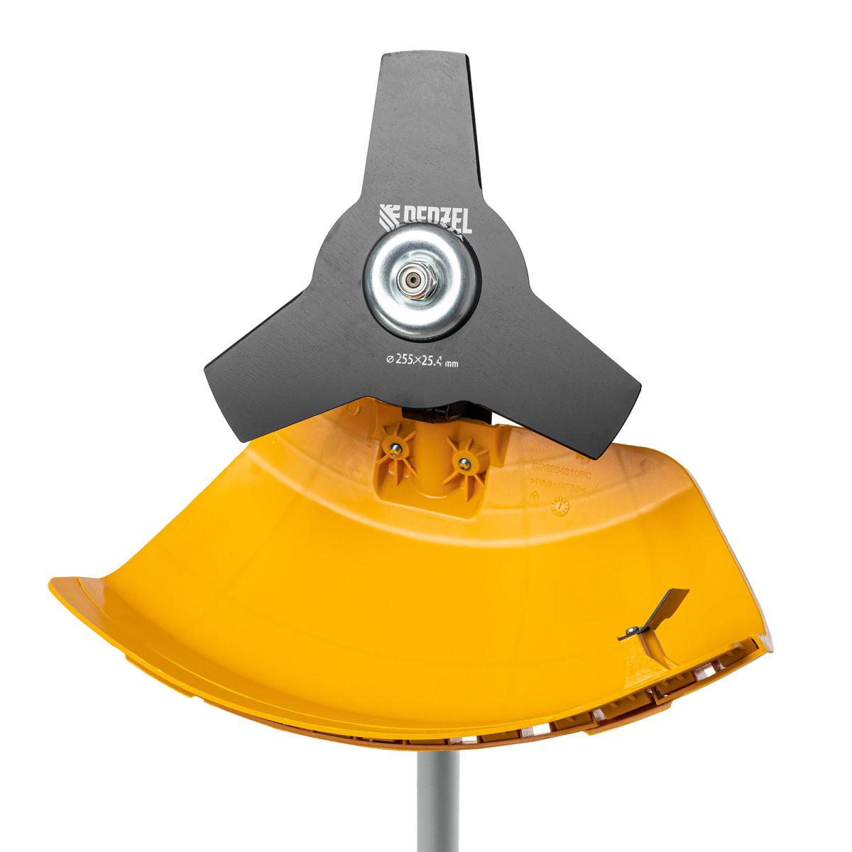 - Дополнительные возможности — можно приобрести диск Denzel 96323 с шириной скашивания 230 мм для быстрого удаления растительности с жесткими стеблями, 96328 для скашивания молодых побегов кустарника диаметром до 3 мм, 96340 для срезания борщевика, кустарника и молодых побегов деревьев с диаметром стволов до 10 мм.
