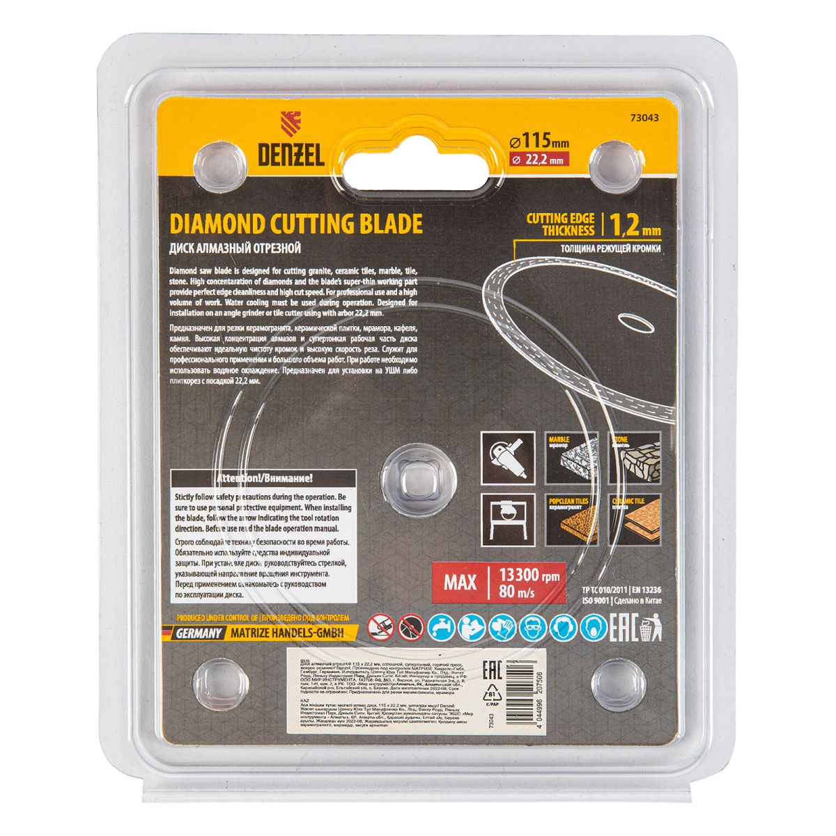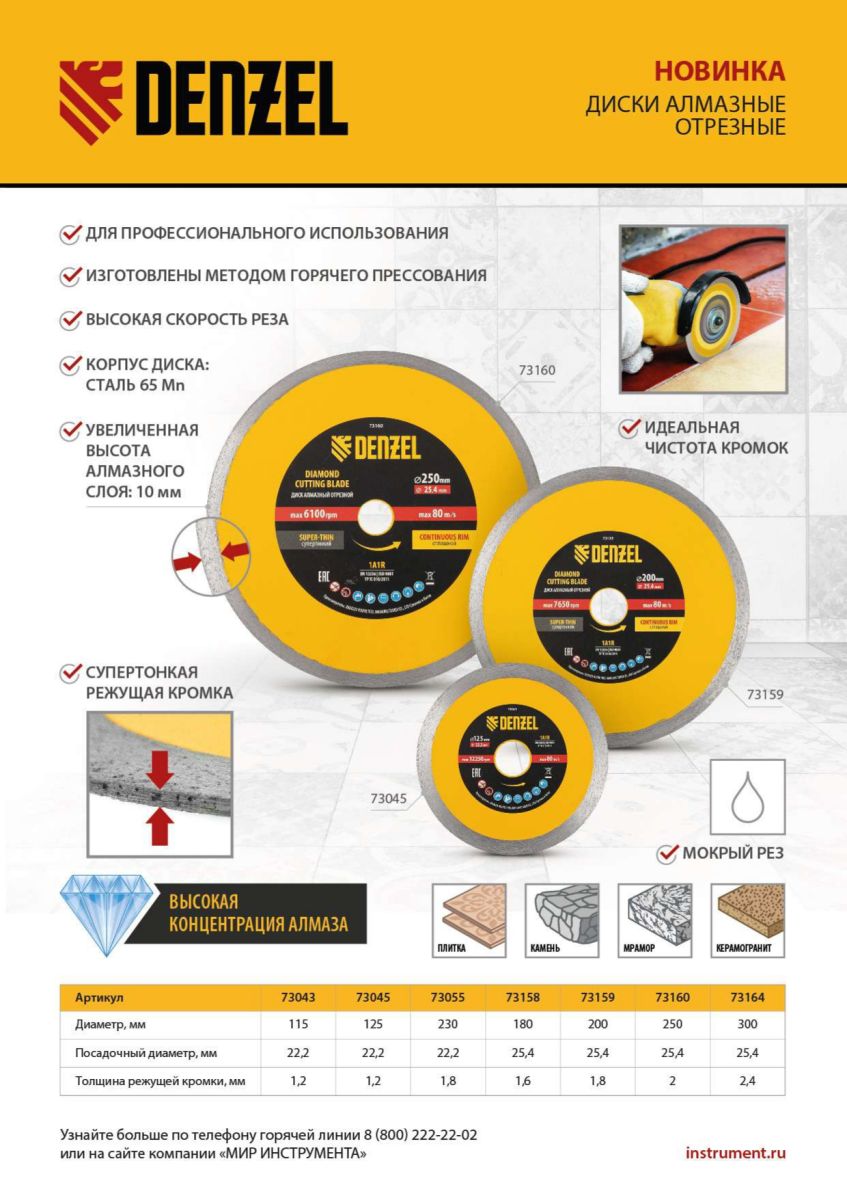 Алмазный диск ТМ Denzel "Сплошной" арт 73043, ф115 х 22,2 мм, предназначен для мокрого резания мрамора, керамогранита и керамическую плитки, камня. Устанавливается на УШМ (болгарку) или плиткорез с посадочным диаметром 22,2 мм. Высокая концентрация алмазов и супертонкая рабочая часть диска обеспечивает идеальную частоту кромок и высокую скорость реза.Диск произведен по технологии горячего прессования с увеличенной шириной режущей кромки (10мм) подходит для профессионального использования и больших объемов работ.