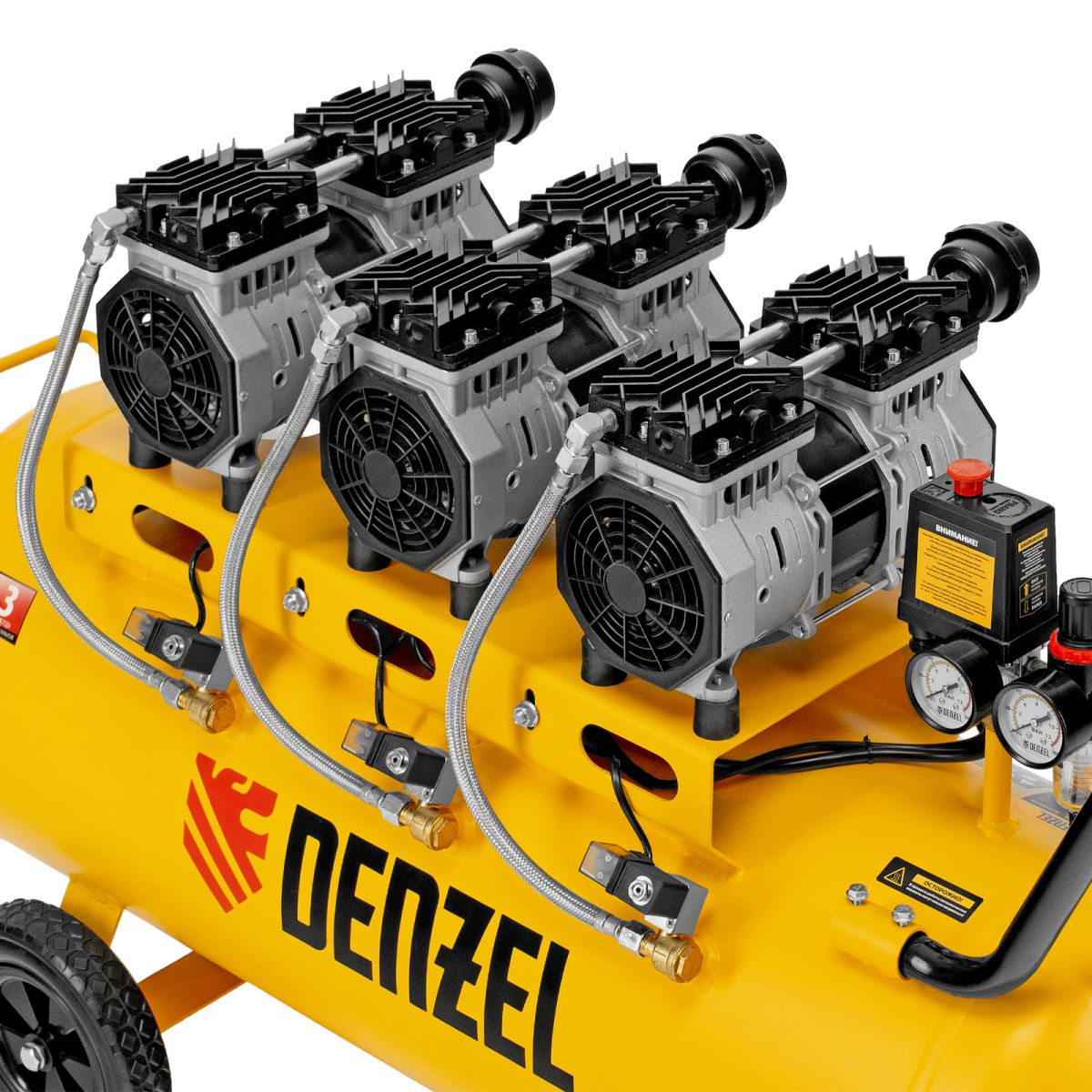 Безмасляный малошумный компрессор Denzel DLS 1800/100 58028 мощностью 1800 (3 х 600) Вт, объемом ресивера 100 л и производительностью 345 л/мин предназначен для обеспечения пневмоинструмента сжатым воздухом, подаваемым под давлением до 8 бар. Позволяет подключить пневматический заклепочник, дрель, шлифмашину и т.д. Оптимален для работы с краскопультом и для продувки электронных компонентов, т. к. в сжатом воздухе отсутствуют частицы масла. Компрессор пригодится в мастерской, гараже, на строительной площадке.