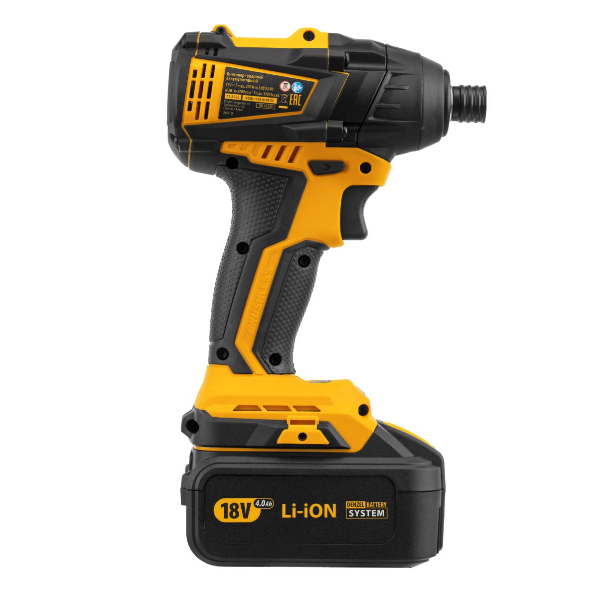 Ударный аккумуляторный винтоверт Denzel CID-IB-200 26510 с бесщеточным двигателем работает от батареи Li-Ion с рабочим напряжением 18 В и предназначен для завинчивания и отвинчивания винтов и шурупов, а также затягивания и откручивания гаек. Эффективен для демонтажа перетянутого и закисшего крепежа, закручивания длинных болтов и шурупов. Пригодится для сборки мебели и различных конструкций.,Аккумуляторный винтоверт не зависит от стационарного источника энергии. Интеллектуальная батарея емкостью 4 А/ч с защитой от перезаряда и глубокого разряда не имеет эффекта памяти, благодаря чему обеспечивает стабильную работу инструмента на протяжении длительного времени.