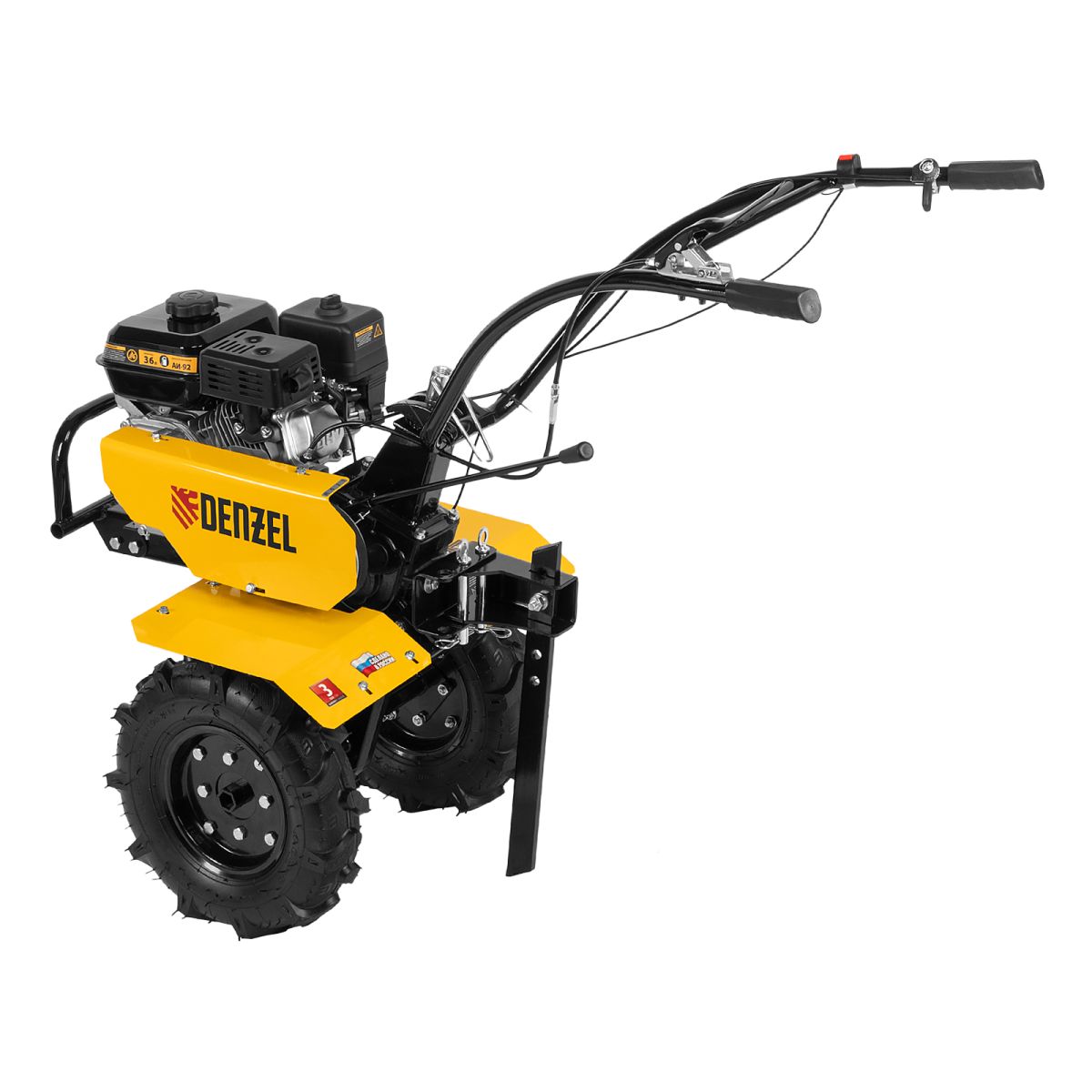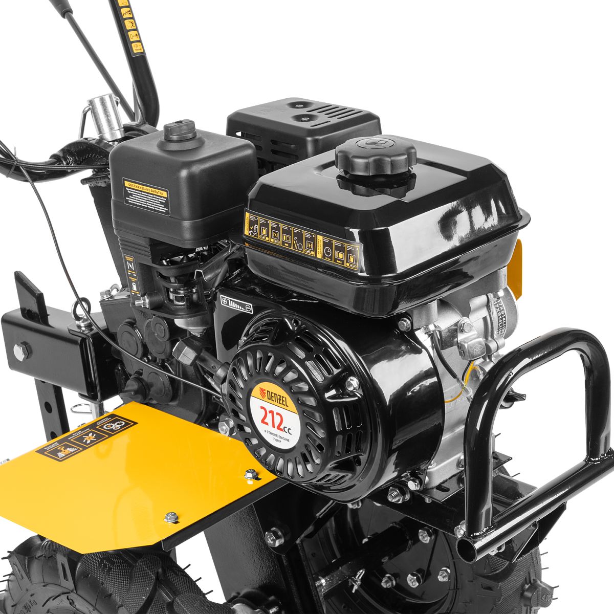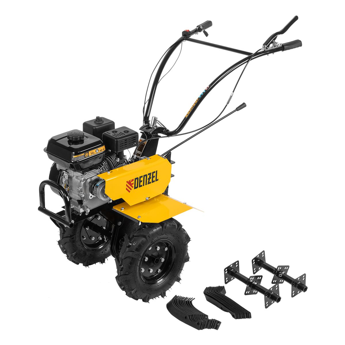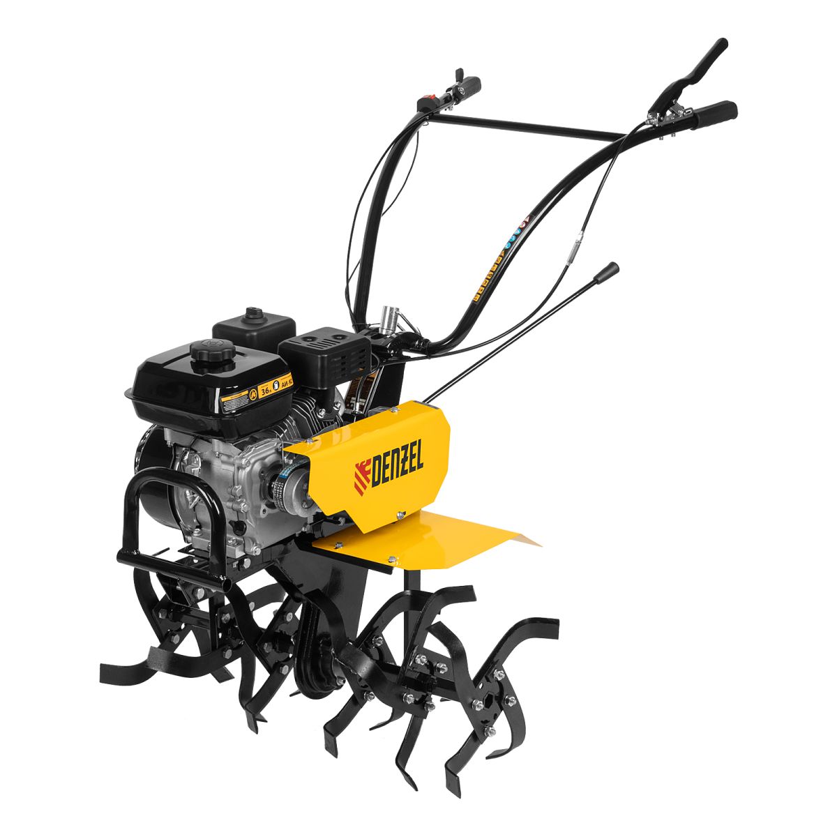 Мотоблок Denzel DPT-270 56432 с двигателем объемом 212 см3 и мощностью 7 л.с., ременным сцеплением, шкивом отбора мощности (ШОМ) и коробкой передач 2В/1Н используется для проведения различных сельскохозяйственных работ. Удобен для обработки участков большой площади: в комплект поставки входит 6 рядов высокопрочных фрез, обеспечивающих ширину вспахивания 85 см и и глубину 35 см. ,Возможность установки различного навесного оборудования, в том числе активного, значительно расширяет возможности мотоблока и позволяет снизить расходы на приобретение сельскохозяйственной техники. Техника совместима с удлинителями осей 59903, 59909, универсальной сцепкой 59904 и 59910, плугами 59905, 59911, окучниками 59906, 59912, 59907, картофелевыкапывателями 59908, 59913, грунтозацепами 59914, 59915, 59916, 59901, 59917, 59902. Установив прицеп Denzel 59950, мотоблок можно использовать в качестве транспортного средства.